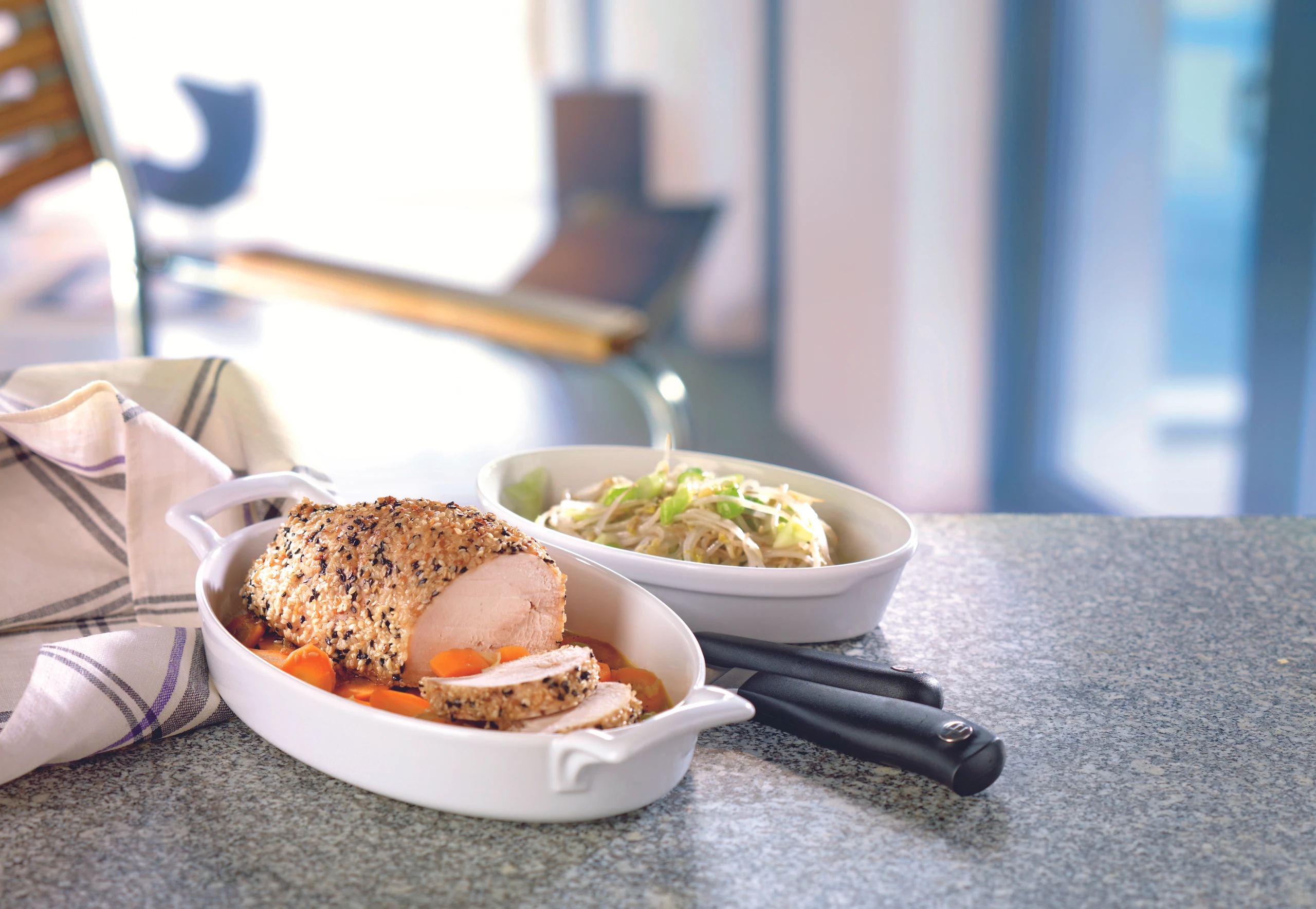 - Rohr auf 160°C vorheizen. Sesam mischen. Fleisch mit Salz, Pfeffer und Koriander würzen und im Sesam wälzen. Fleisch in Öl rundum gut anbraten und im Rohr (untere Schiene / Gitterrost) ca. 1 Stunde braten.