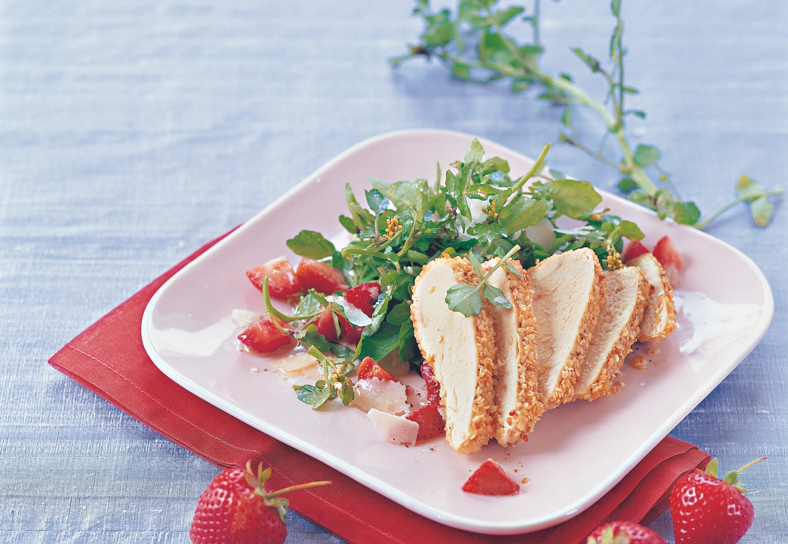 Sesamhühnchen auf Brunnenkressesalat mit Erdbeeren