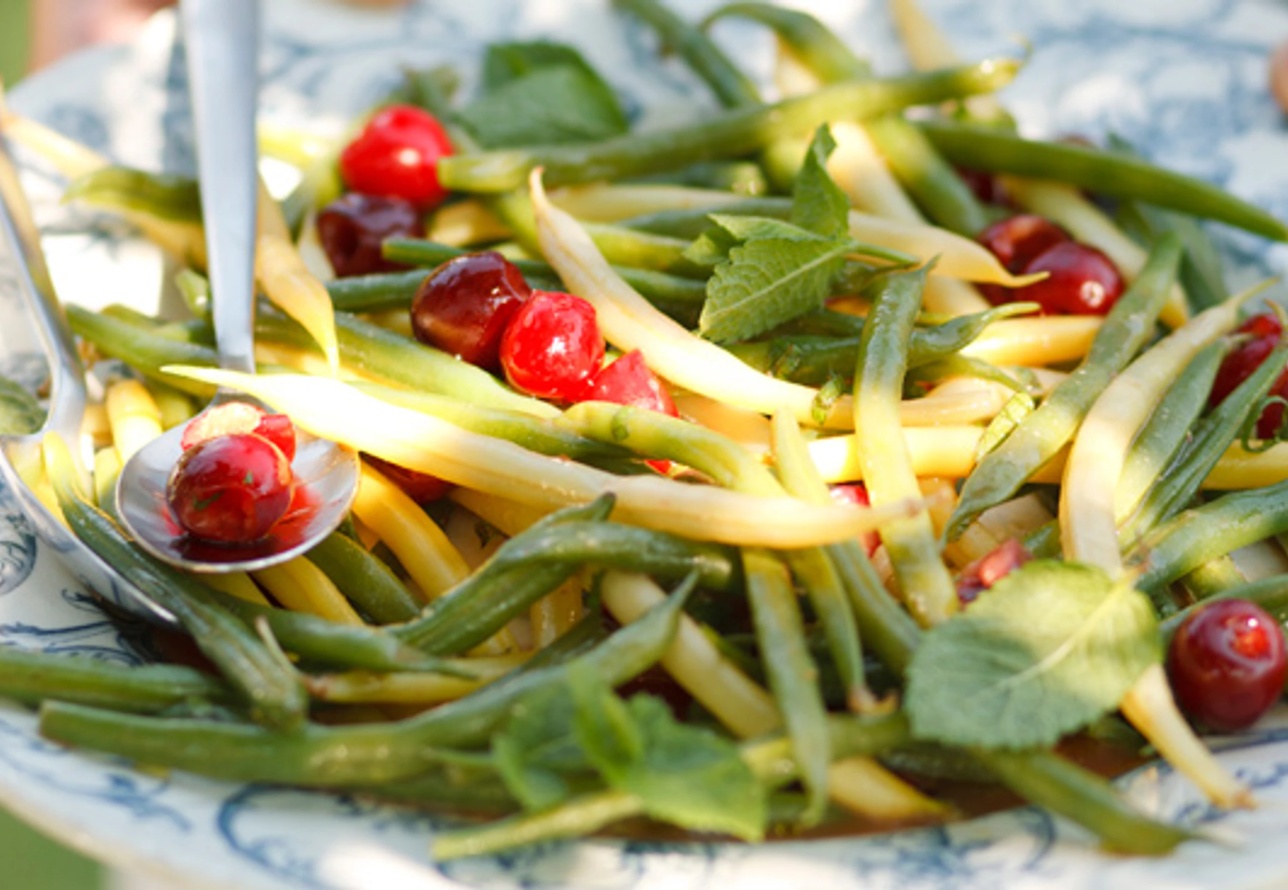 Fisolen putzen und in Salzwasser bissfest kochen. Herausheben, in Eiswasser abschrecken und gut abtropfen lassen. Weichseln entkernen.