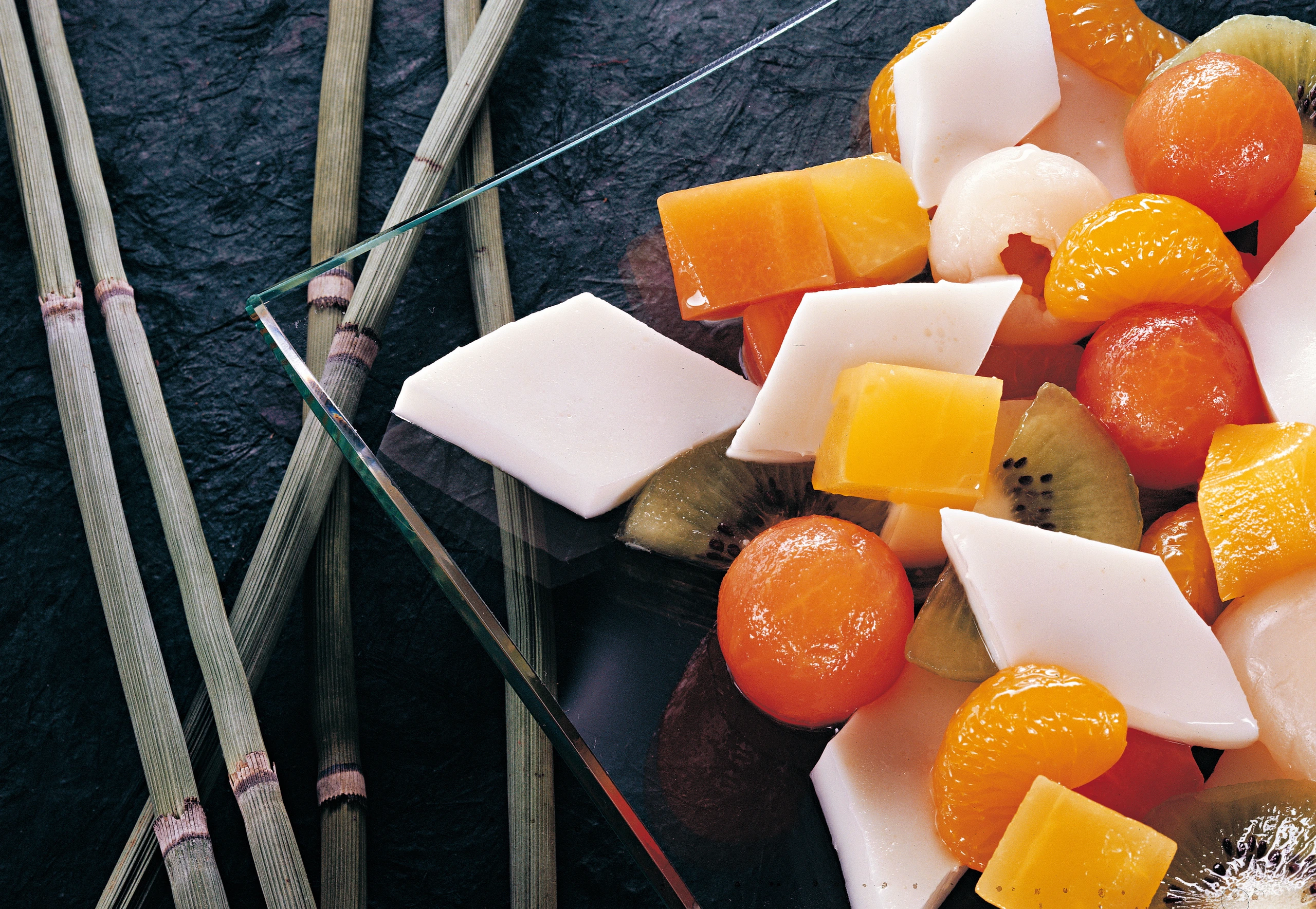 Das erstarrte Gelee in Rauten schneiden und gut gekühlt mit dem Sirup servieren. Dazu passt Salat aus frischen Früchten.