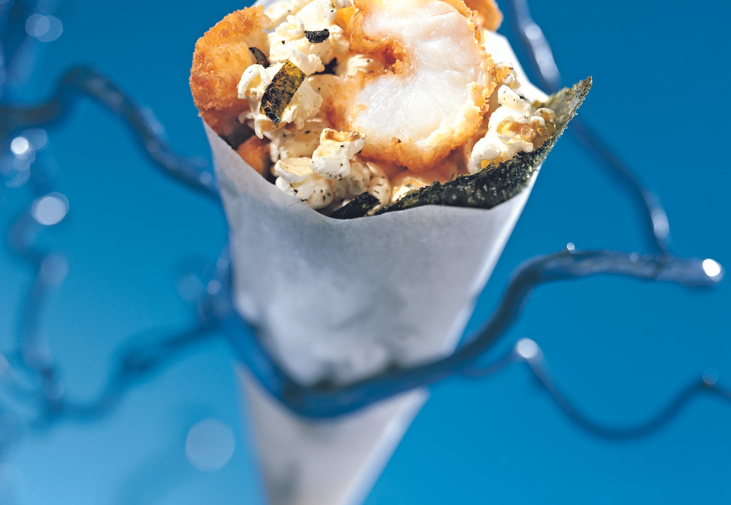 Garnelen in Mehl, Ei und Bröseln panieren, in heißem Öl schwimmend backen. Garnelen längs halbieren und abwechselnd mit dem Nori-Popcorn in Stanitzel füllen.