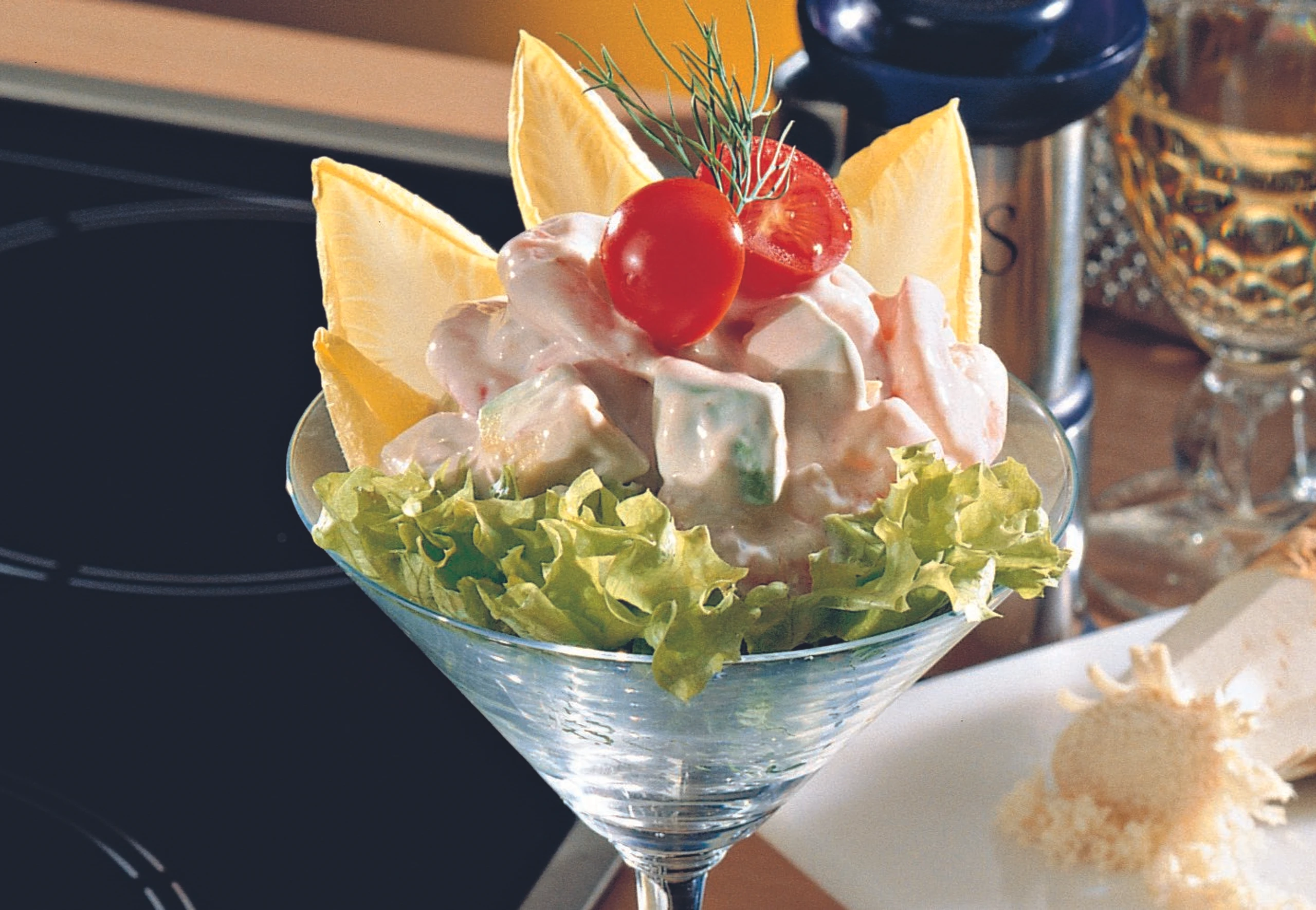 Salatblätter waschen und gut abtropfen lassen. Kirschparadeiser halbieren. Cocktailschalen mit den Salatblättern auslegen, Shrimpssalat einfüllen und mit Kirschparadeisern garnieren.