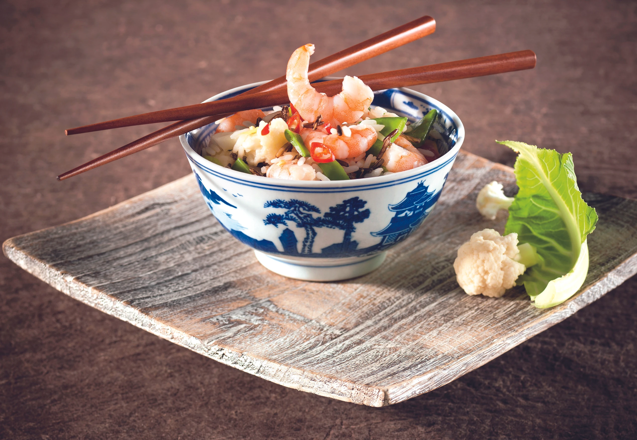 - In einer Pfanne Olivenöl und Butter erhitzen, Paprika, Jungzwiebeln und Erbsenschoten darin anbraten und salzen. Garnelen, Karfiol und Chili zugeben und kurz mitbraten. Reis unterrühren, mit Salz und Pfeffer würzen. Je nach Geschmack kann man das Gericht mit grob gehackten Kräutern (Basilikum oder Koriander) verfeinern.