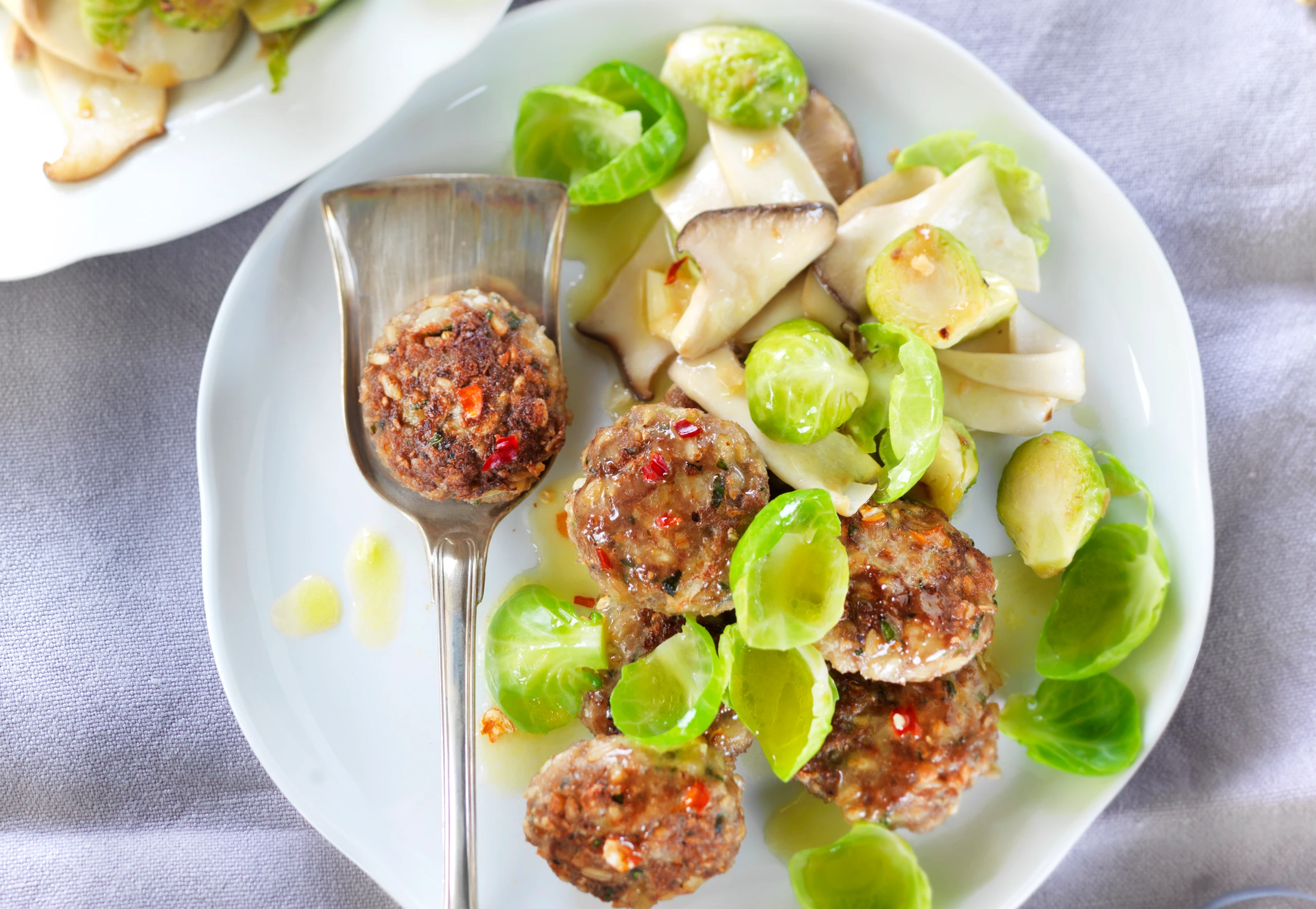 Laibchen mit den Kohlsprossen und Pilzen anrichten, mit den Kohlblättchen und Chili garnieren.