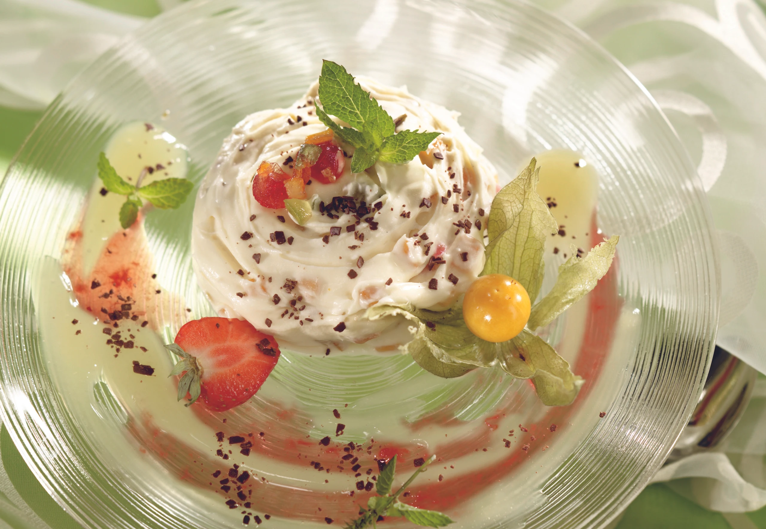 - Für die Garnitur Erdbeeren und kandierte Kirschen halbieren. Mousse mit den beiden Saucen anrichten, mit Früchten, Schokostreusel und Minze garniert servieren.