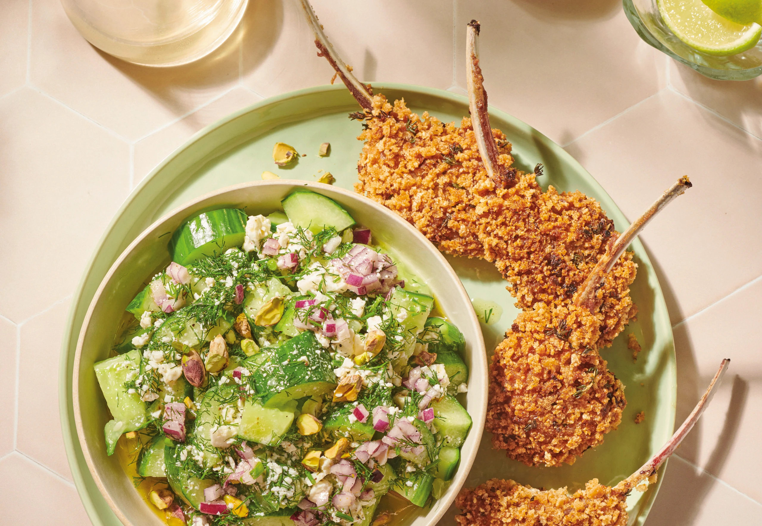 Smashed Gurkensalat mit Feta-Dill-Dressing und knusprigen Lammkoteletts