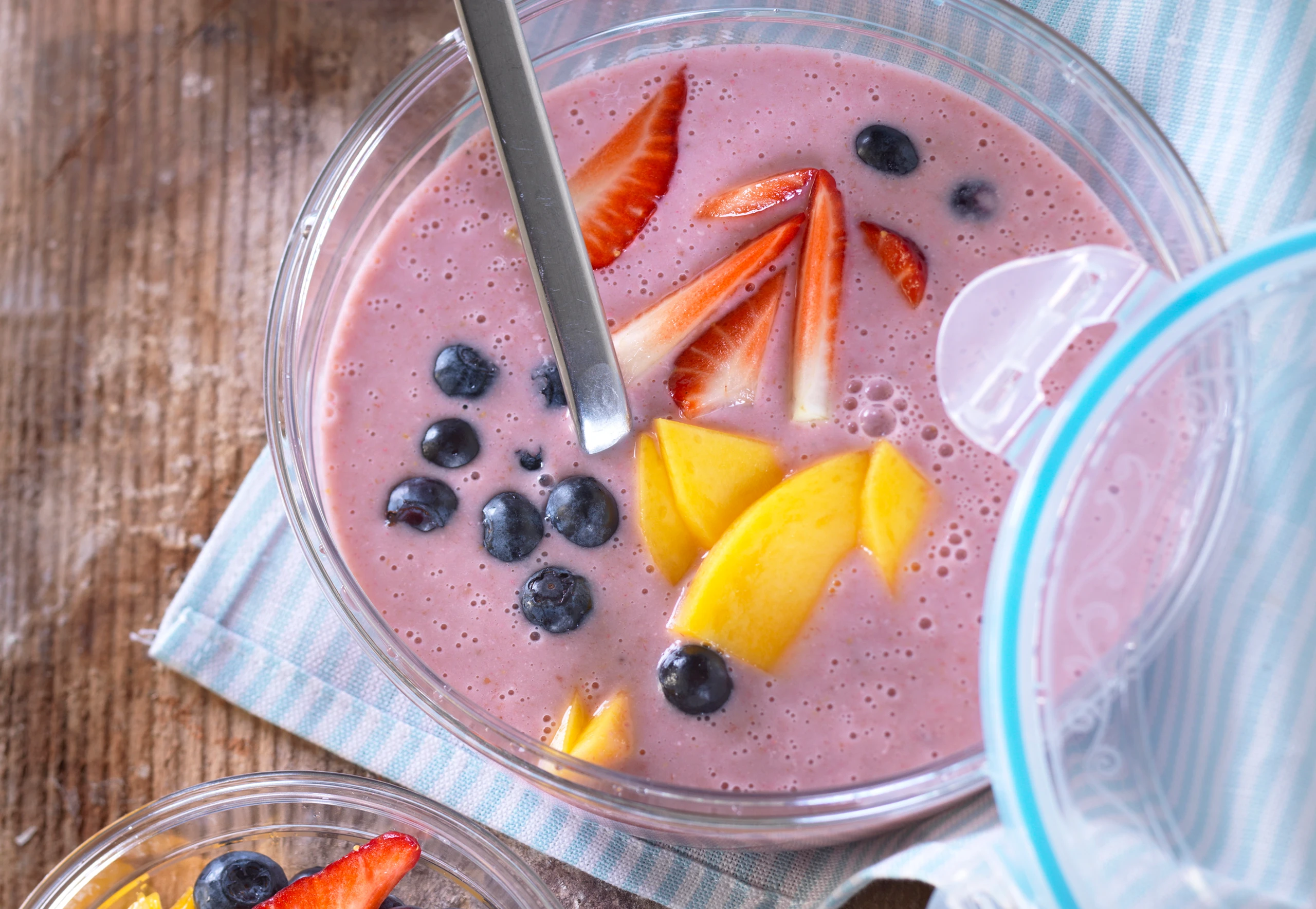 - Smoothie und Früchte getrennt verpacken und mitnehmen. Smoothie-Bowl mit übrigen Erdbeeren, Heidelbeeren und Mango anrichten.
