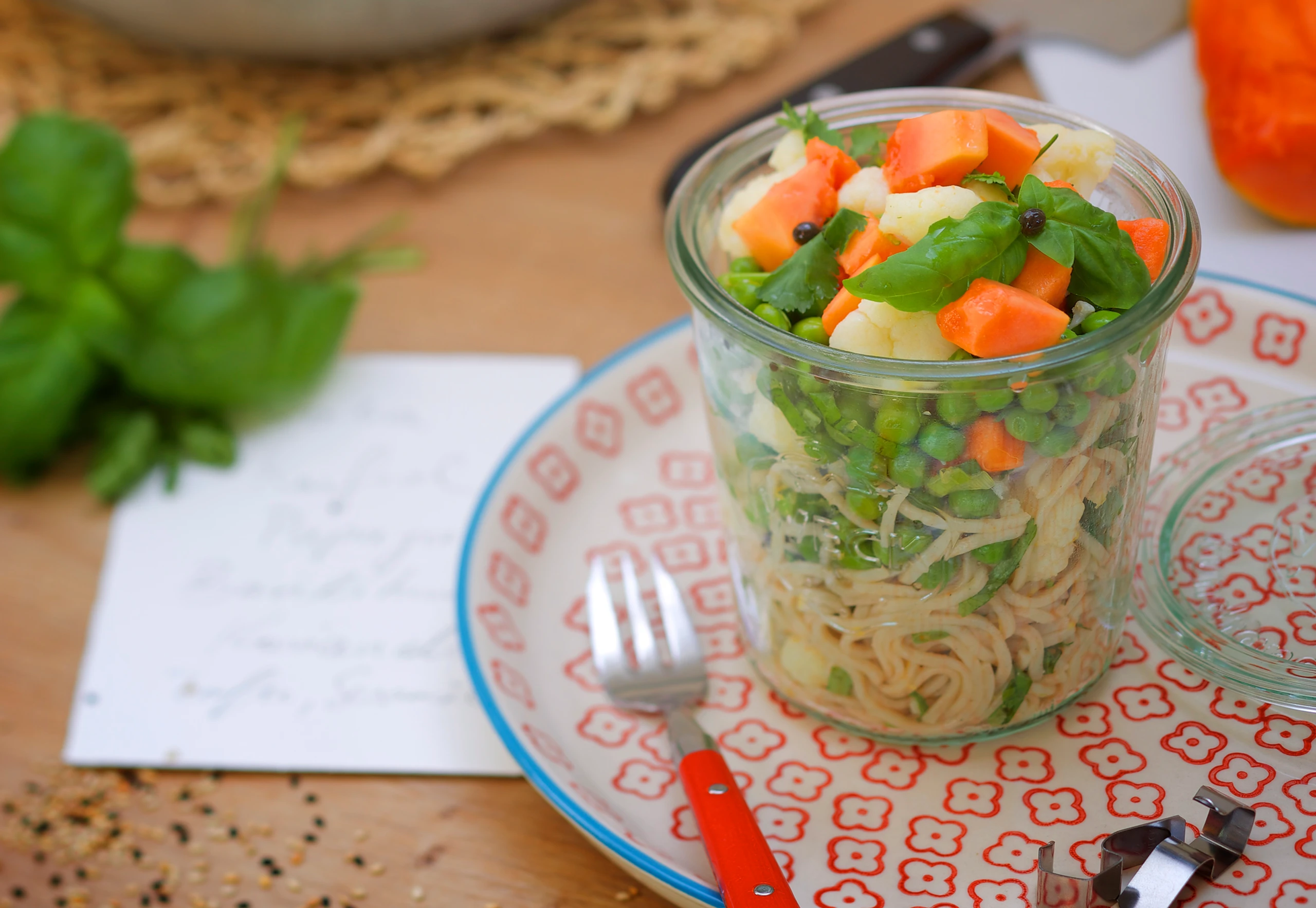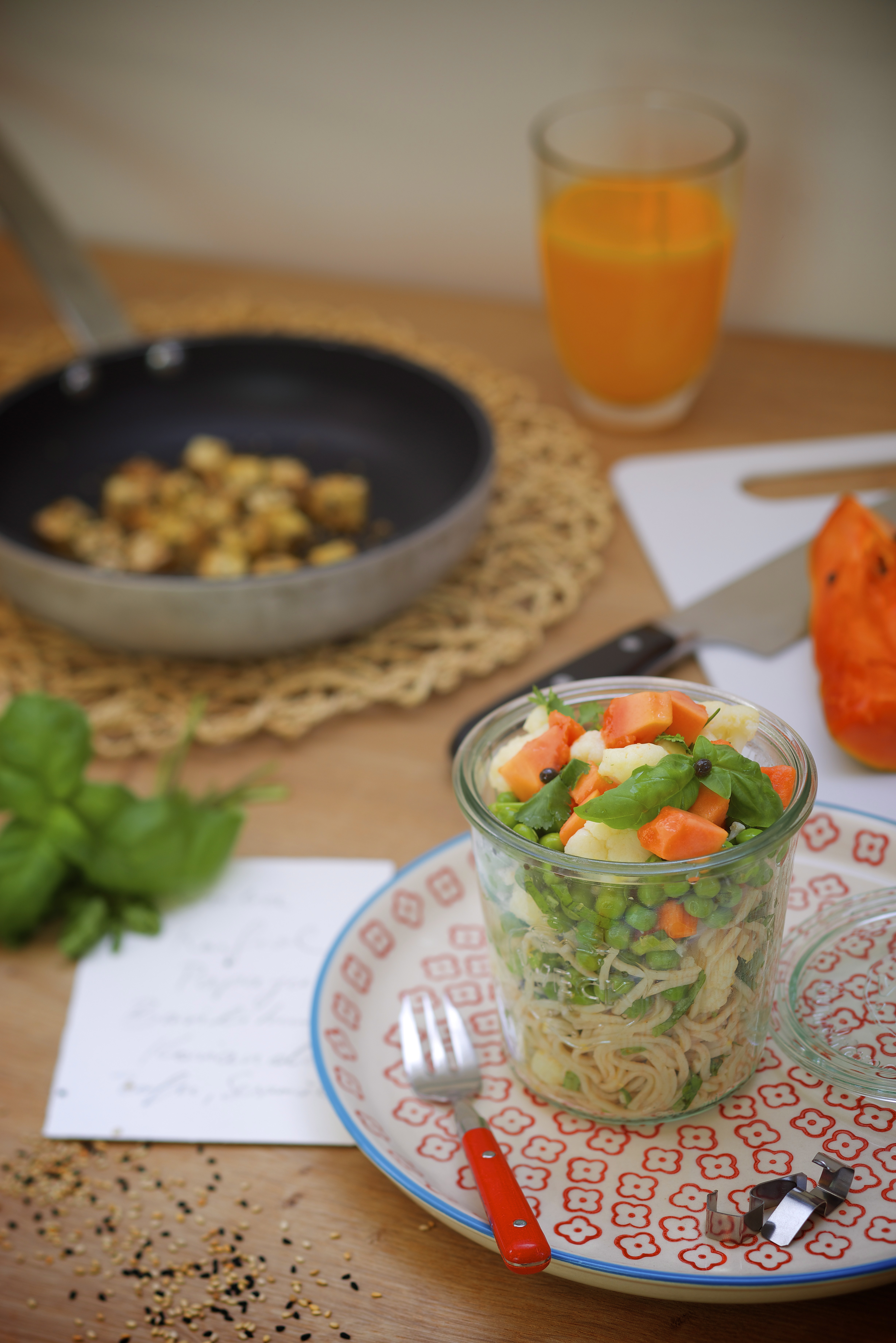 Jungzwiebel putzen und in feine Ringe, Papaya in Würfel schneiden, beides mit den Nudeln mischen. Salat mit Basilikum und Koriander und Papayakernen garnieren.