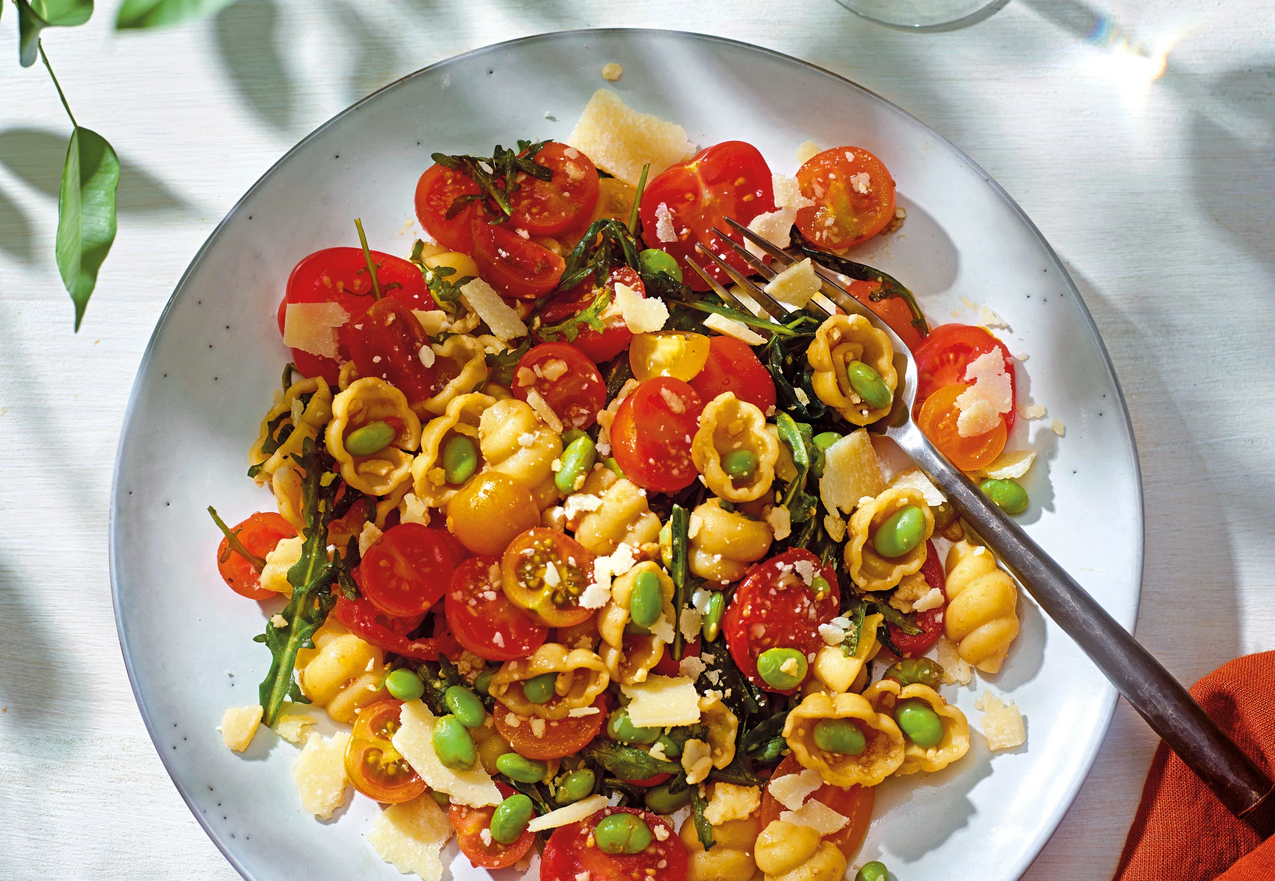 Pasta, Sojabohnen und Paradeiser zum Salat geben, Parmesan darüber streuen.
