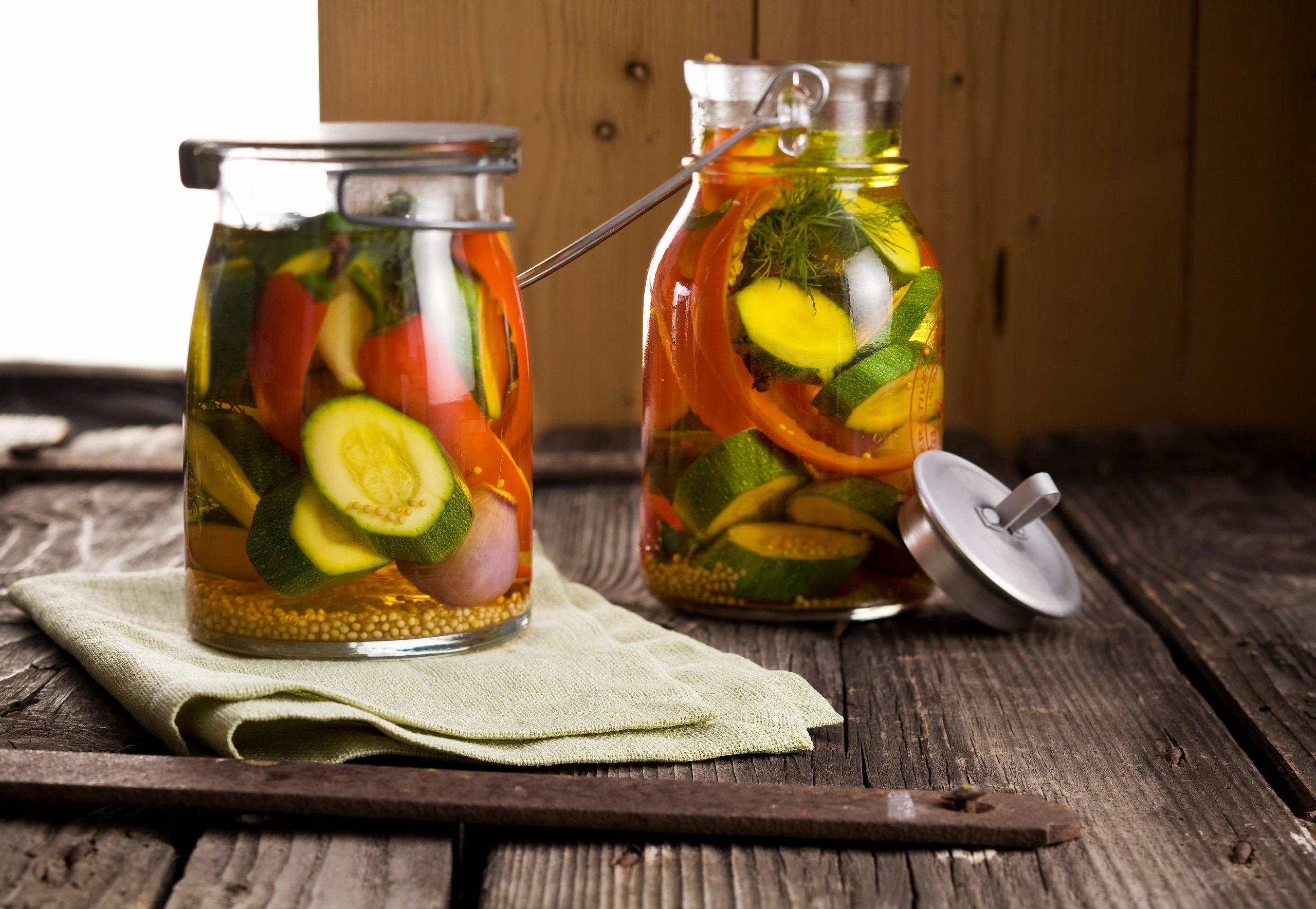 - Verjus mit den Gewürzen vermischen und aufkochen. Gemüse darin ca. 10 Minuten bissfest kochen. Gemüse in gut gereinigte Gläser füllen, mit dem Fond übergießen und noch heiß verschließen.