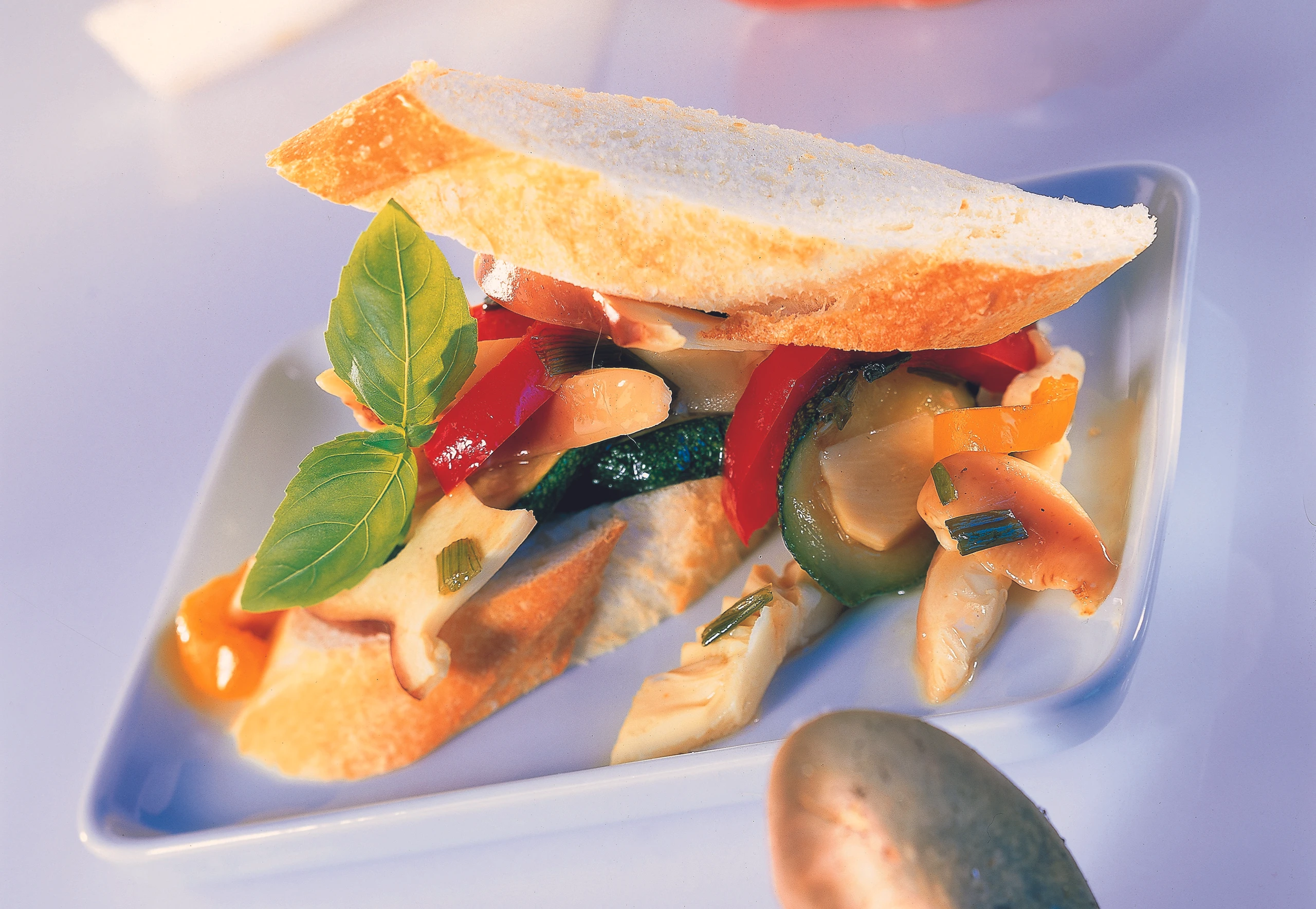 Butter und Olivenöl in einer Pfanne erhitzen. Jungzwiebeln und Knoblauch zugeben und kurz anbraten. Zucchini und Paprika zugeben und kurz dünsten. Pilze untermischen, salzen und pfeffern und unter häufigem Umrühren ca. 15 Minuten dünsten.