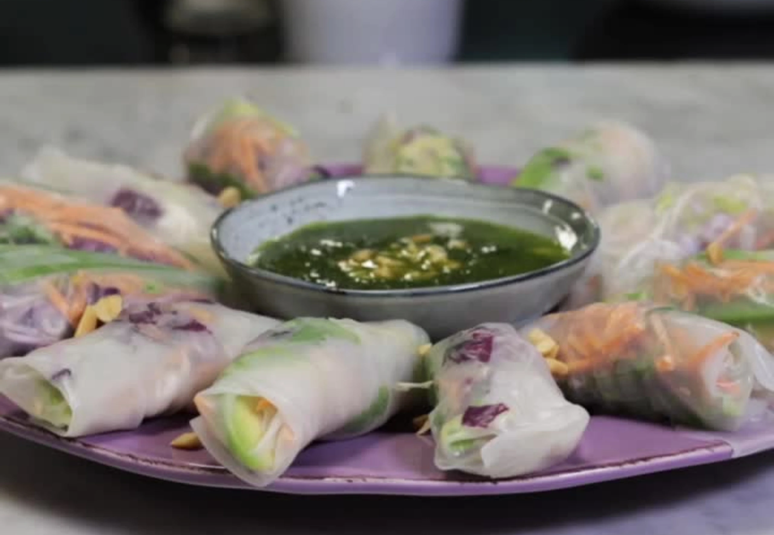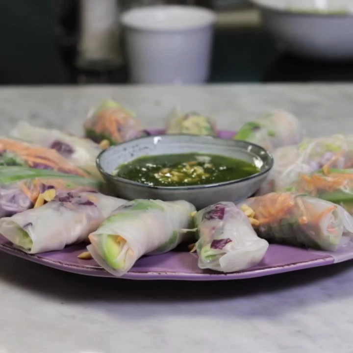 Sommerrollen mit übrig gebliebenen Erdnüssen bestreuen und zusammen mit dem Dip servieren.