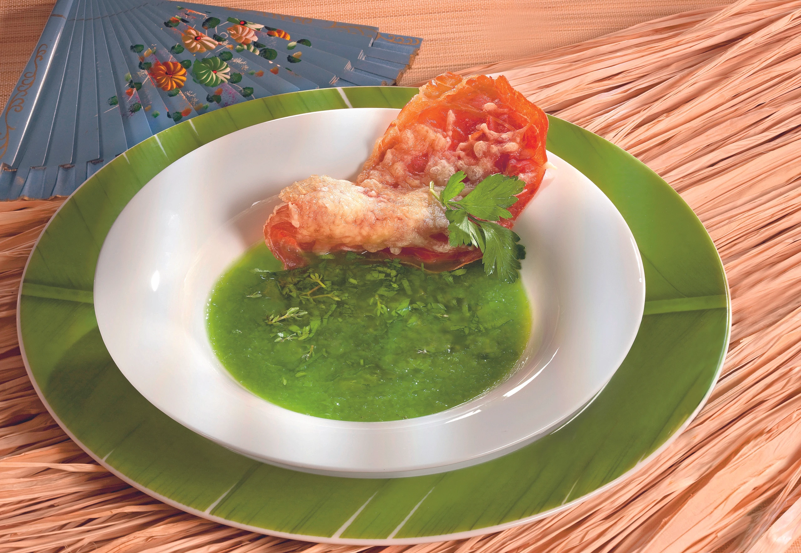 - Suppe in Teller schöpfen, mit übrigen Kräutern und Schinken garniert servieren.