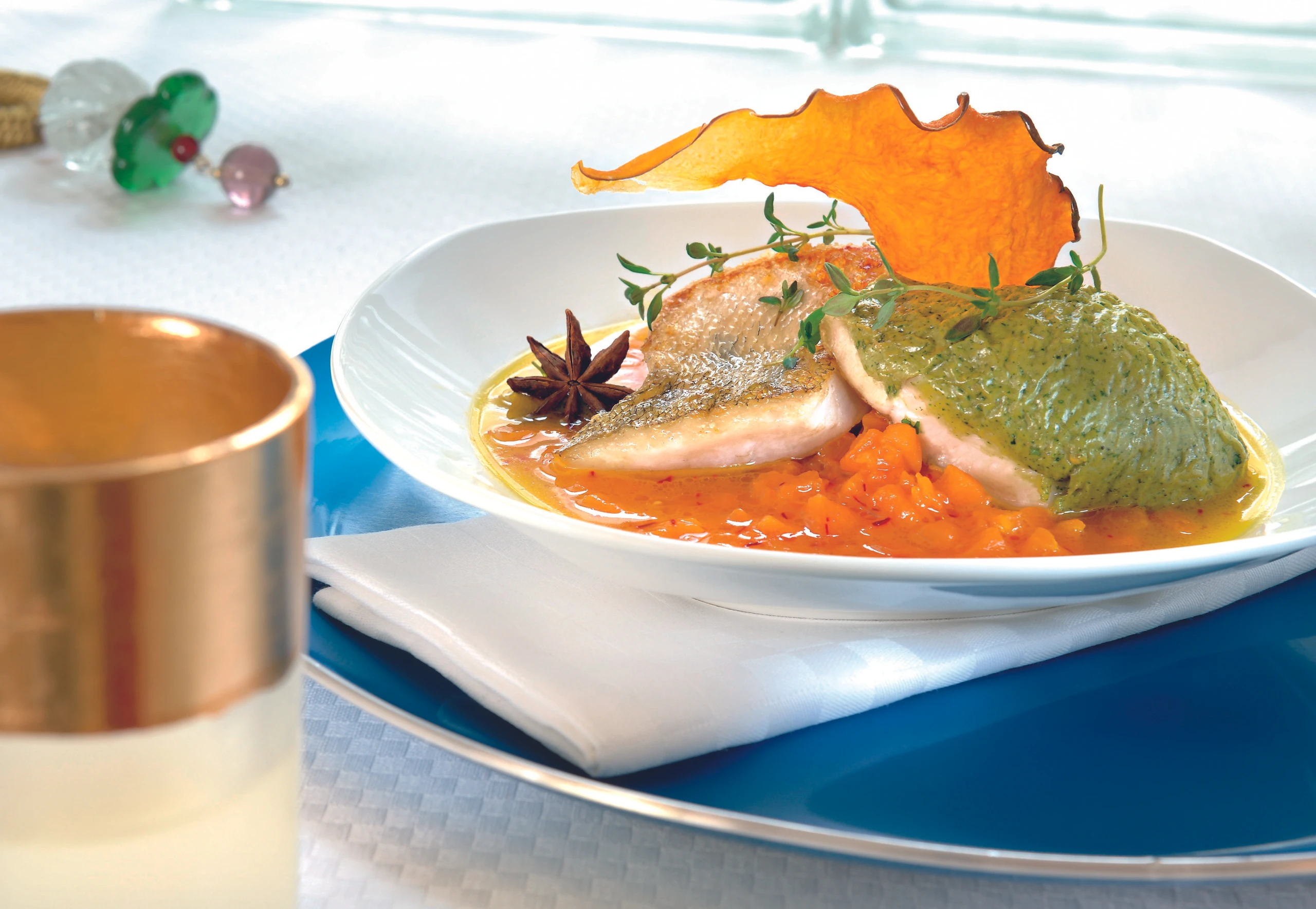 - Kürbisgemüse in tiefe Teller füllen, Fischfilets darauf anrichten, mit Kürbis-Chips garnieren.
