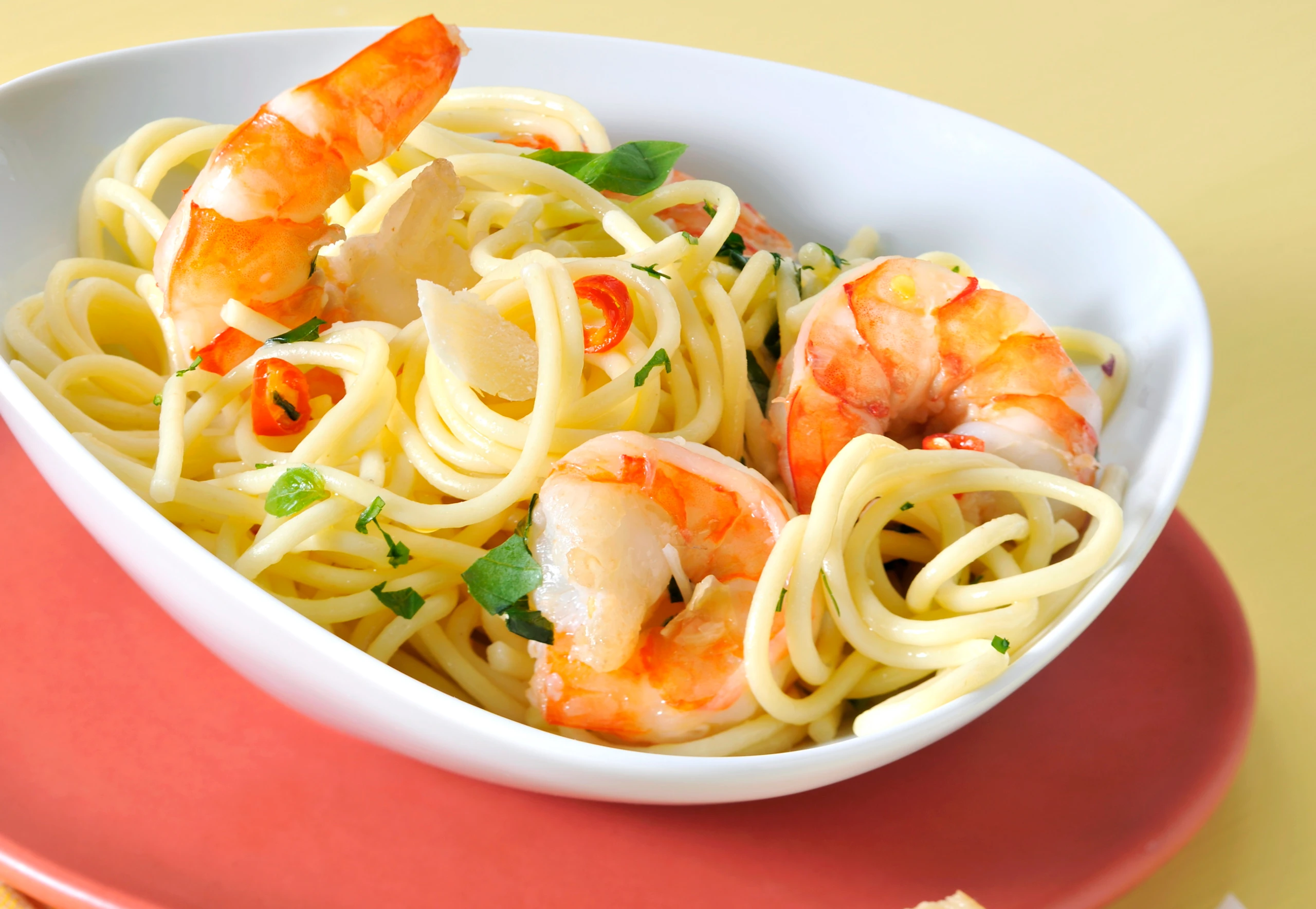 Parallel dazu Spaghetti in reichlich Salzwasser bissfest kochen. Abseihen, kurz abschrecken, abtropfen lassen und in der Pfanne mit Garnelen, Knoblauch und Chilis vermischen. Übriges Basilikum untermischen. Pasta anrichten und mit Parmesan garniert servieren.