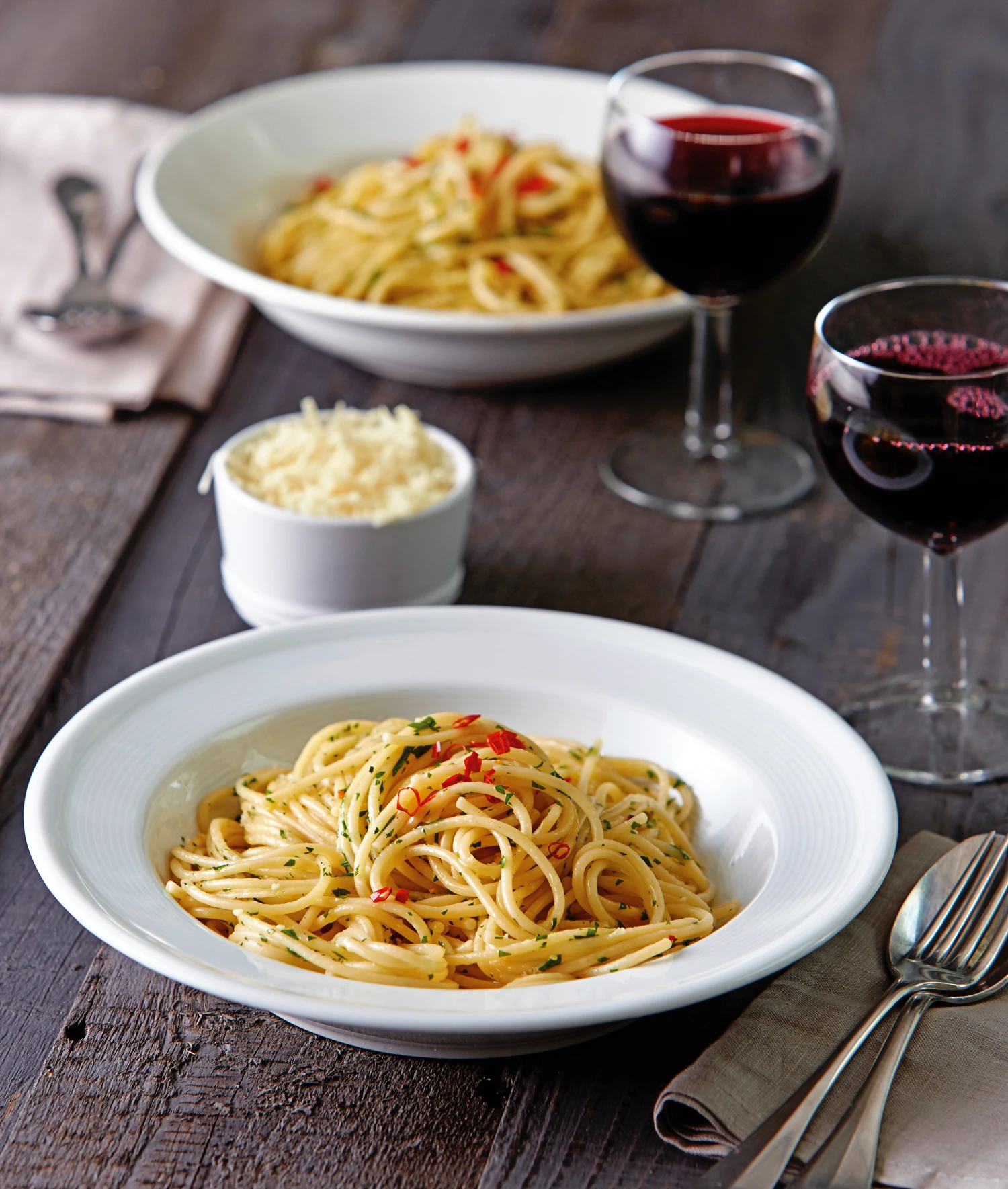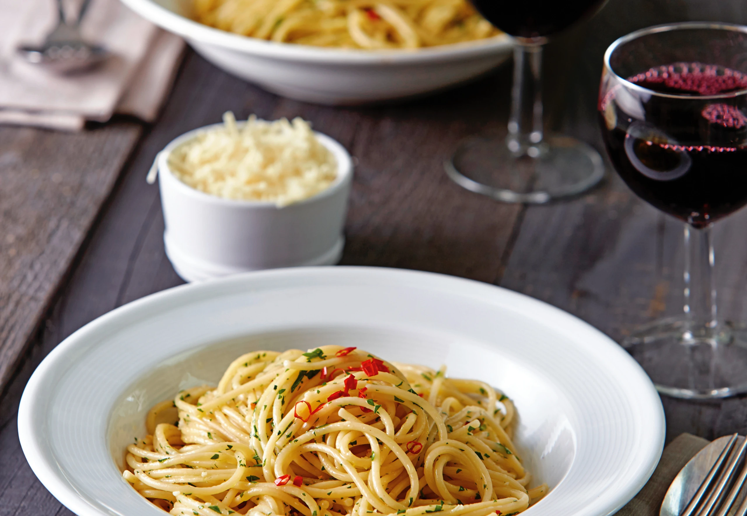 Chili und Knoblauch in Öl anschwitzen, dabei umrühren. Zuerst Petersilie, dann Spaghetti untermischen und mit Salz und Pfeffer würzen. Spaghetti mit dem Parmesan bestreut servieren.