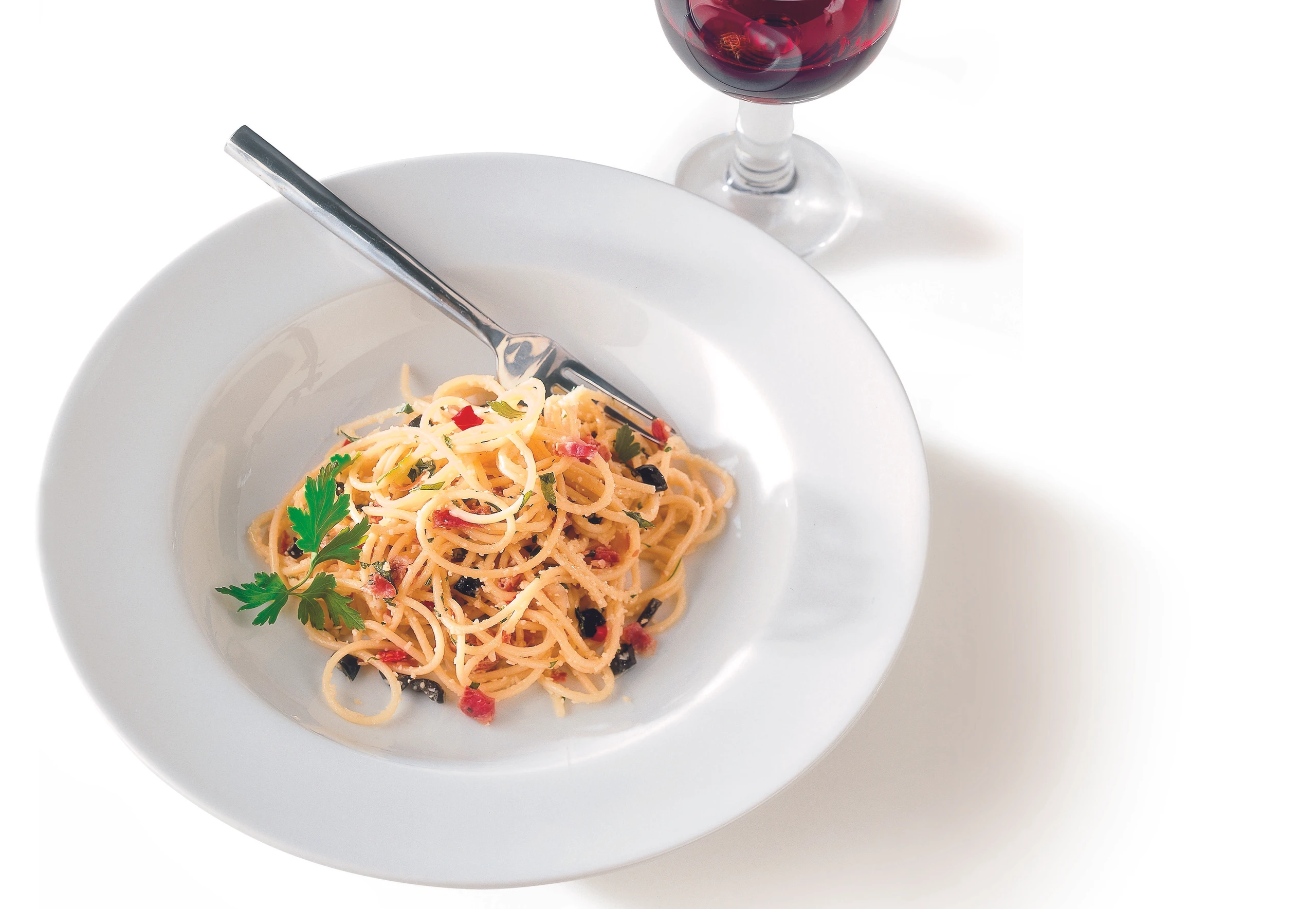 Schinken und Oliven klein schneiden. Knoblauch schälen und hacken. In einer großen Pfanne Knoblauch in Öl anschwitzen, Schinken, Oliven, Peperoncini und Petersilie zugeben und kurz mitbraten.