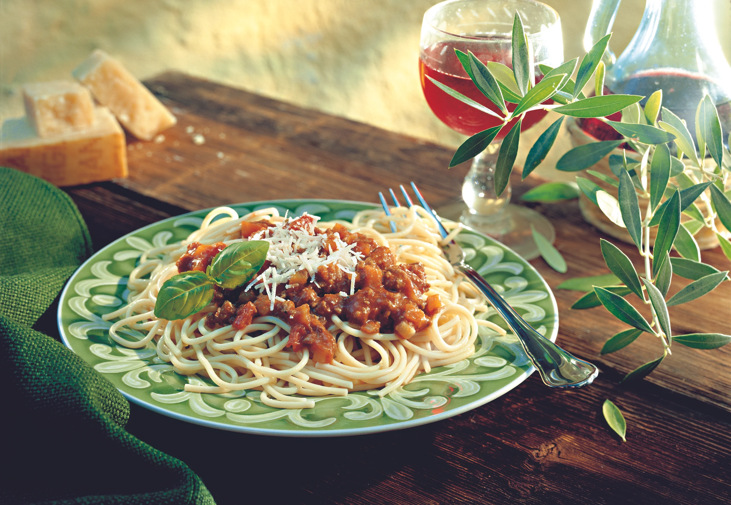 Spaghetti in Salzwasser bissfest kochen, abseihen und gut abtropfen lassen. Spaghetti mit der Sauce anrichten, mit geriebenem Parmesan bestreuen und servieren.