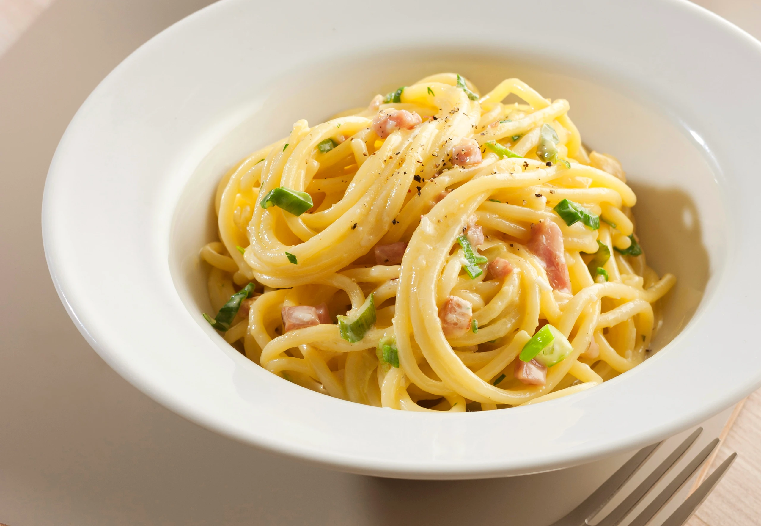Speck, Zwiebel und Knoblauch in 3 EL Öl anrösten und mit den Spaghetti vermischen. Obers-Dottermischung unterrühren und stocken lassen. Spaghetti mit Salz und Pfeffer abschmecken und anrichten.