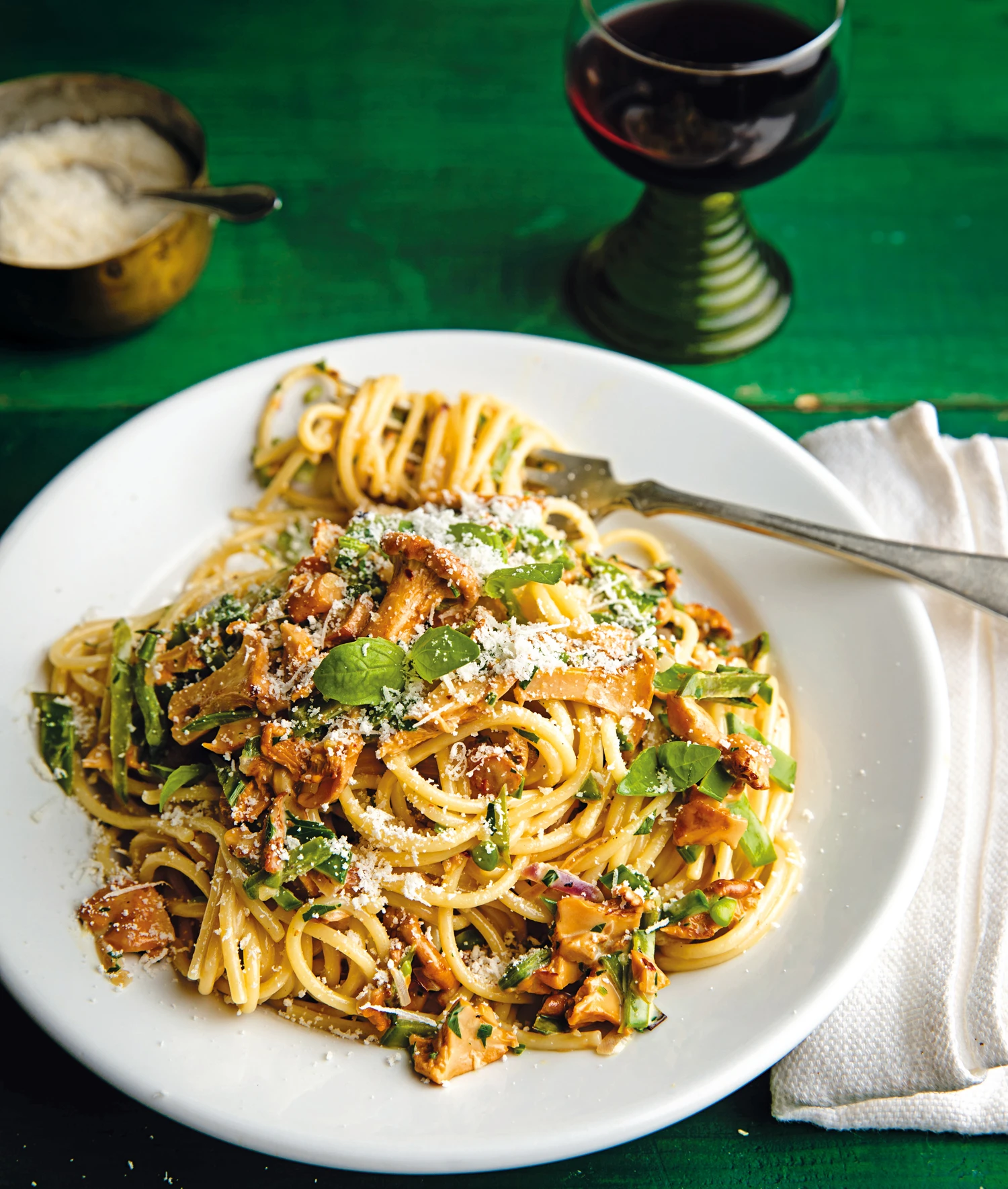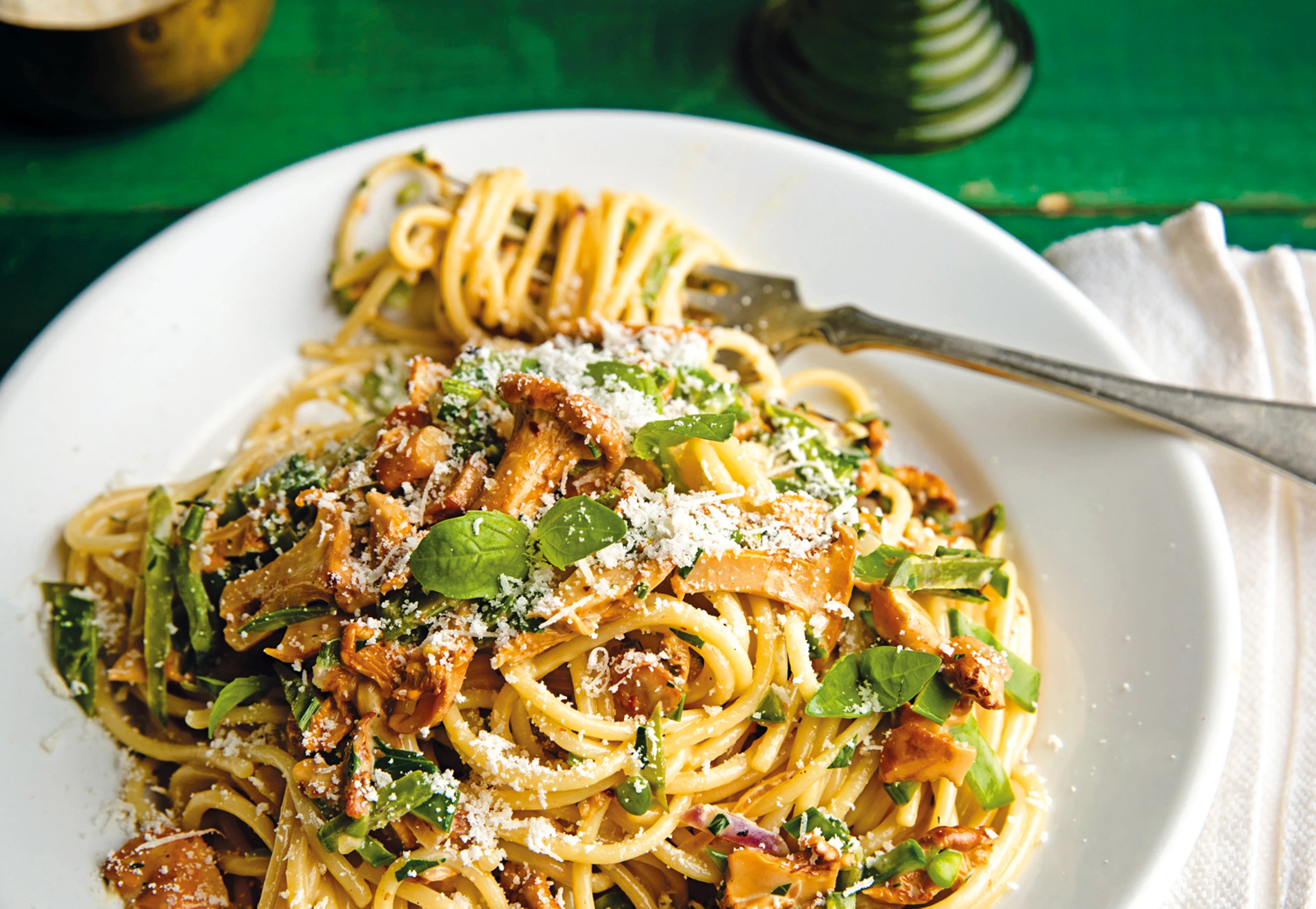 Spaghetti mit Eierschwammerlsauce und Zuckerschoten