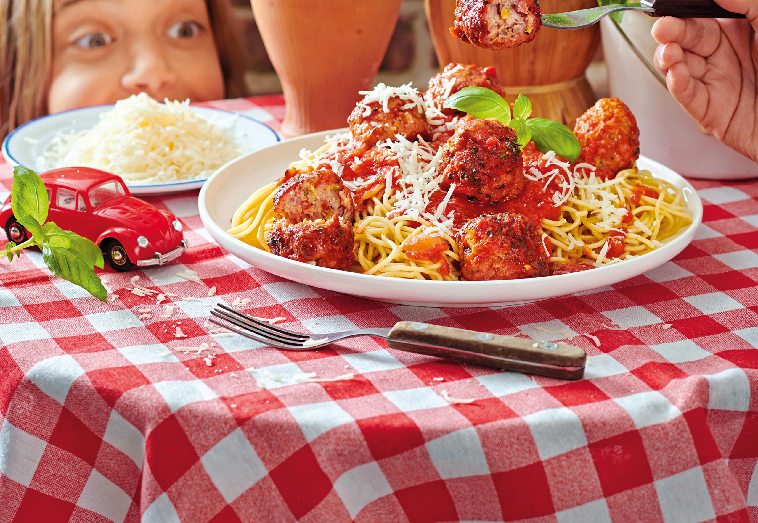 Pasta, Sauce und Fleischbällchen anrichten, mit Parmesan bestreuen und mit Basilikum garnieren.