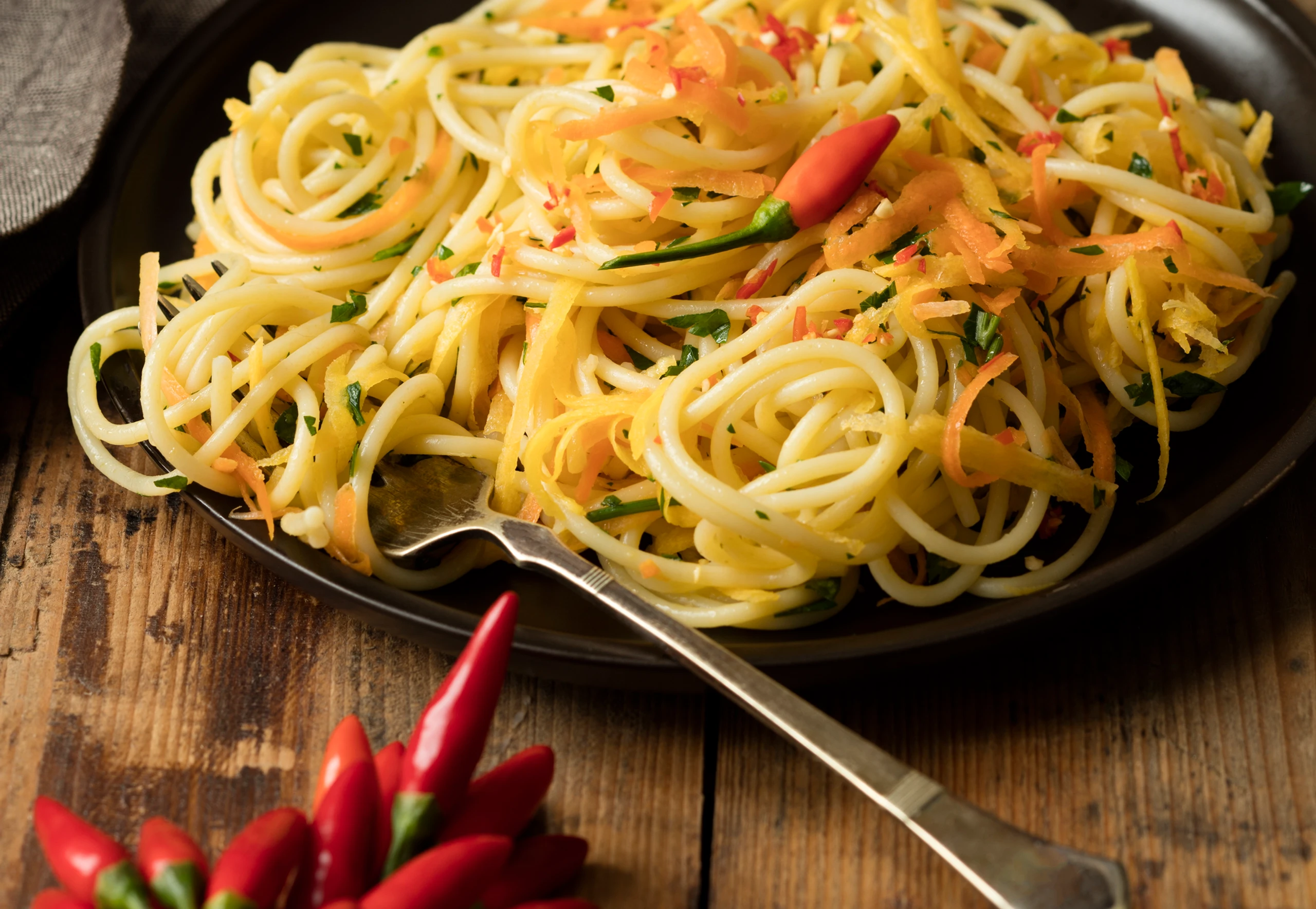 Spaghetti in reichlich Salzwasser kochen. Zeitgleich Gemüse, Knoblauch und Chilis in Olivenöl hell anbraten. Spaghetti abseihen, kurz abtropfen lassen, mit der Gemüsemischung vermengen, mit Salz und Pfeffer würzen, Petersilie untermengen.