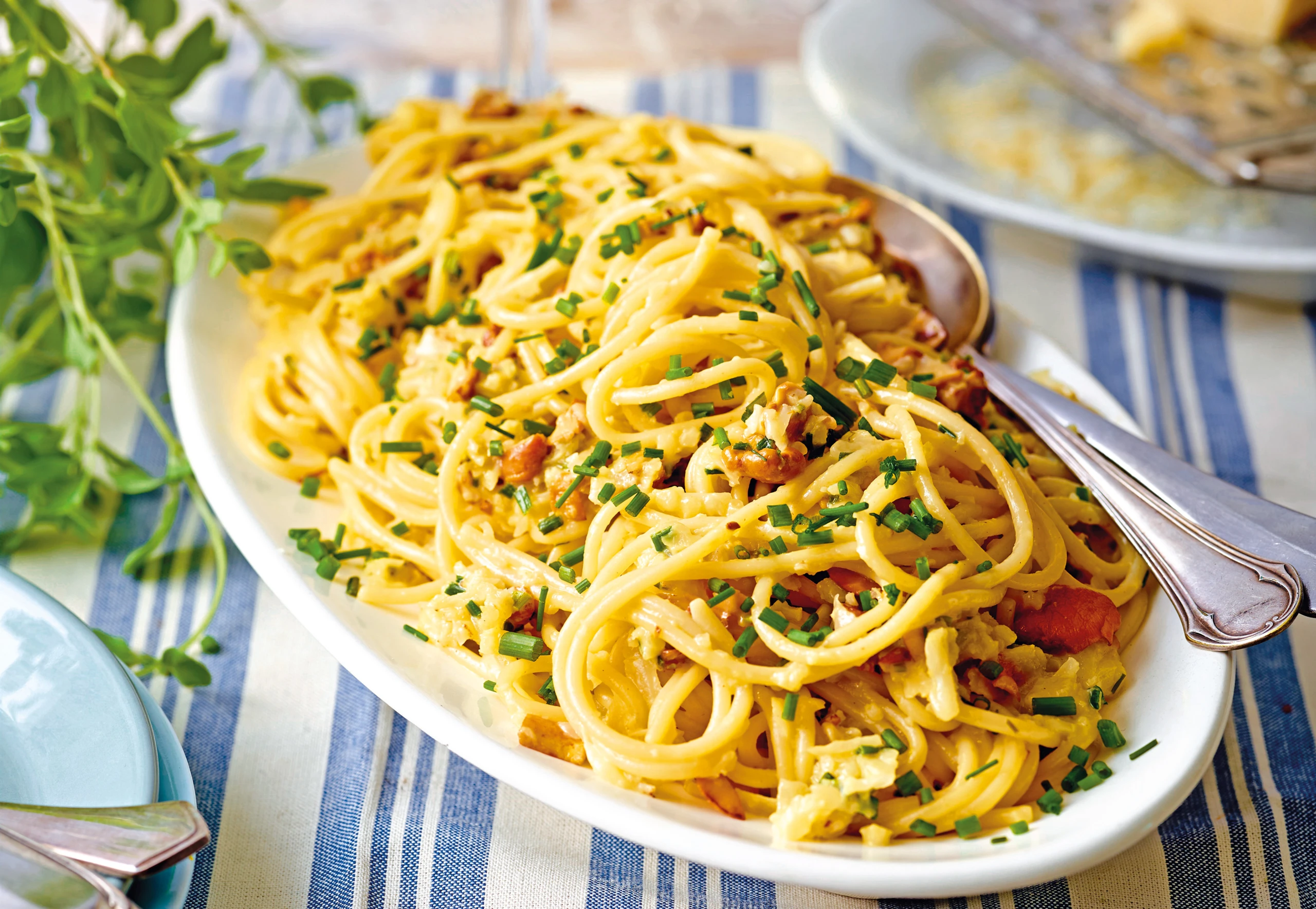 Spaghetti, Karfiol, Schwammerl, Dottermischung und die Hälfte vom Schnittlauch behutsam vermischen, mit Salz und Pfeffer würzen. Spaghetti anrichten und mit übrigem Schnittlauch bestreut servieren.