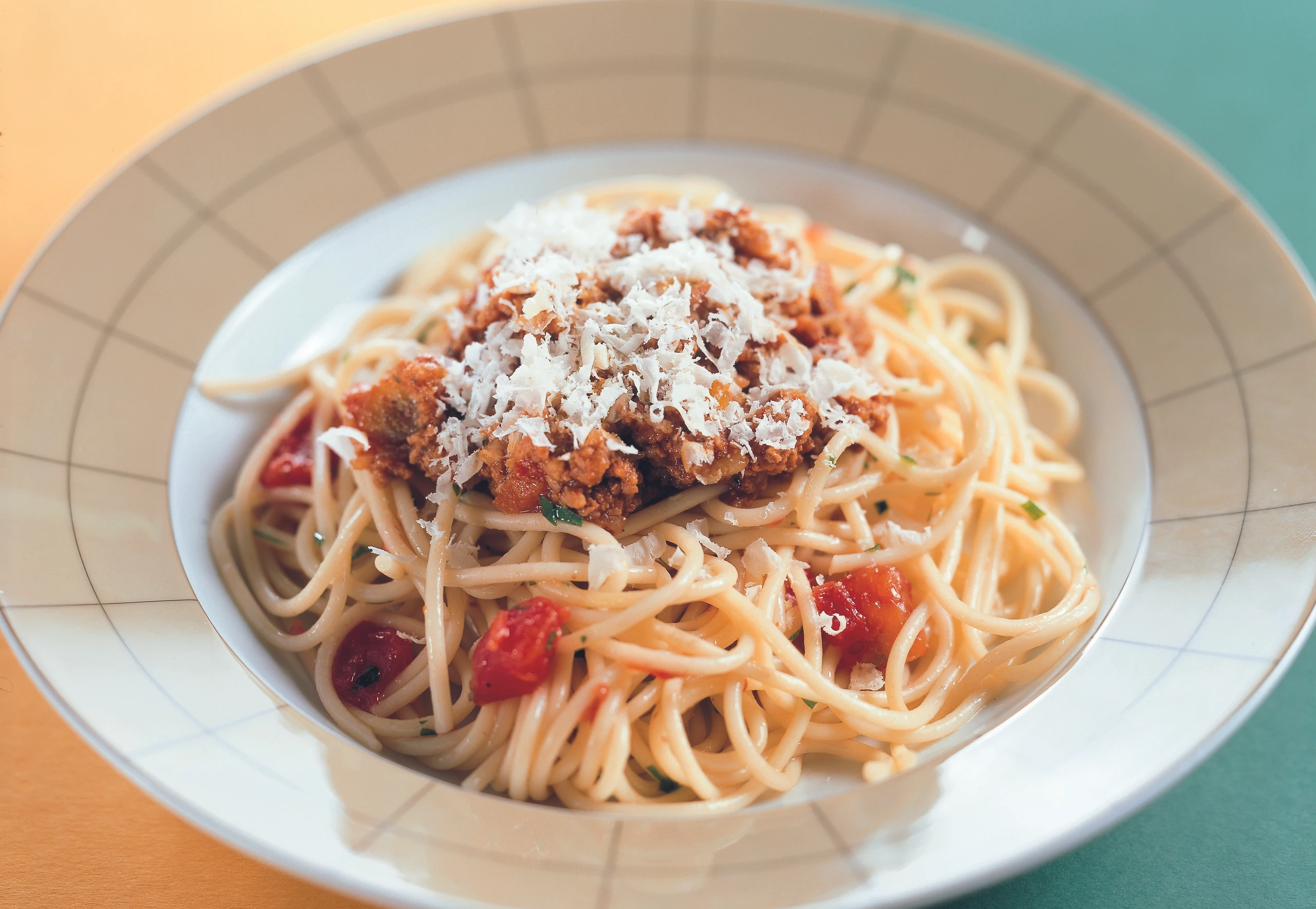 Spaghetti bissfest kochen, abseihen, abtropfen lassen und in aufgeschäumter Butter mit den reservierten Paradeiserstücken kurz schwenken. Spaghetti mit dem Sugo anrichten und mit Parmesan bestreuen.