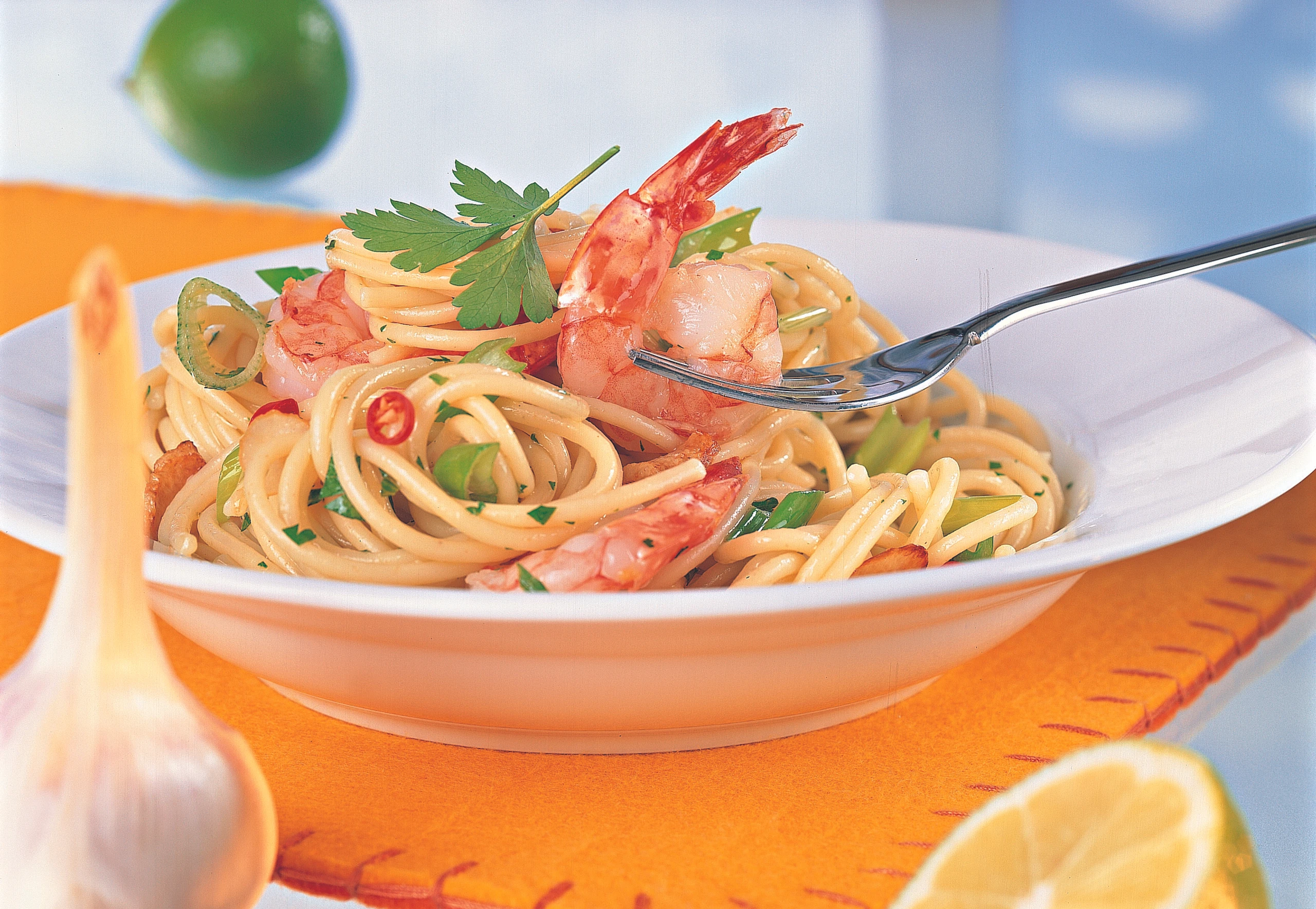 Spaghetti, Garnelen und Gemüse vermischen. Alles unter Rühren erhitzen. Petersilie untermischen. Spaghetti mit Zitronensaft und Salz abschmecken.