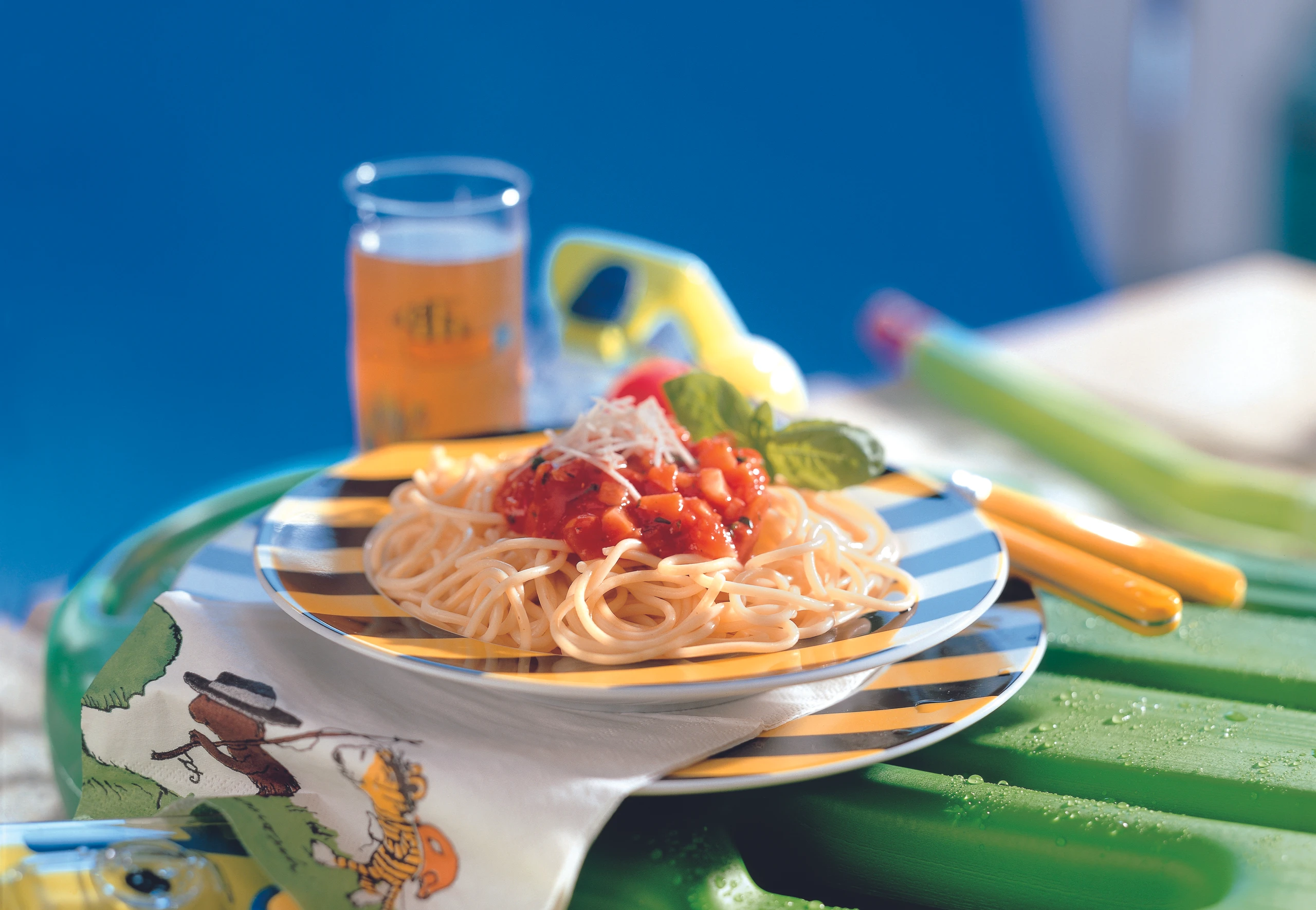 Spaghetti mit Gemüse-Tomatensauce und Basilikum