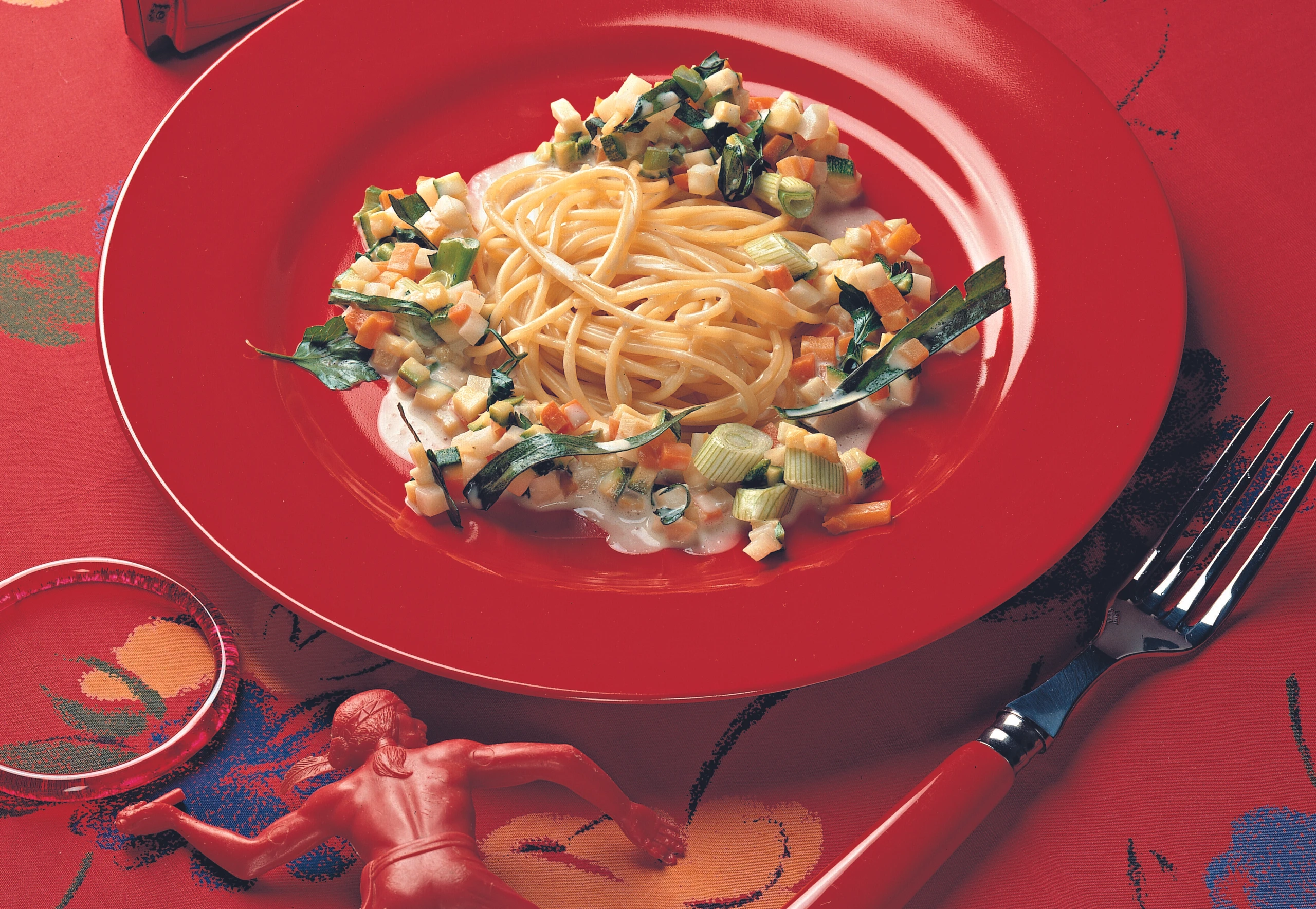 Parallel dazu Spaghetti bißfest kochen, abseihen, gut abtropfen lassen und mit der Sauce anrichten.