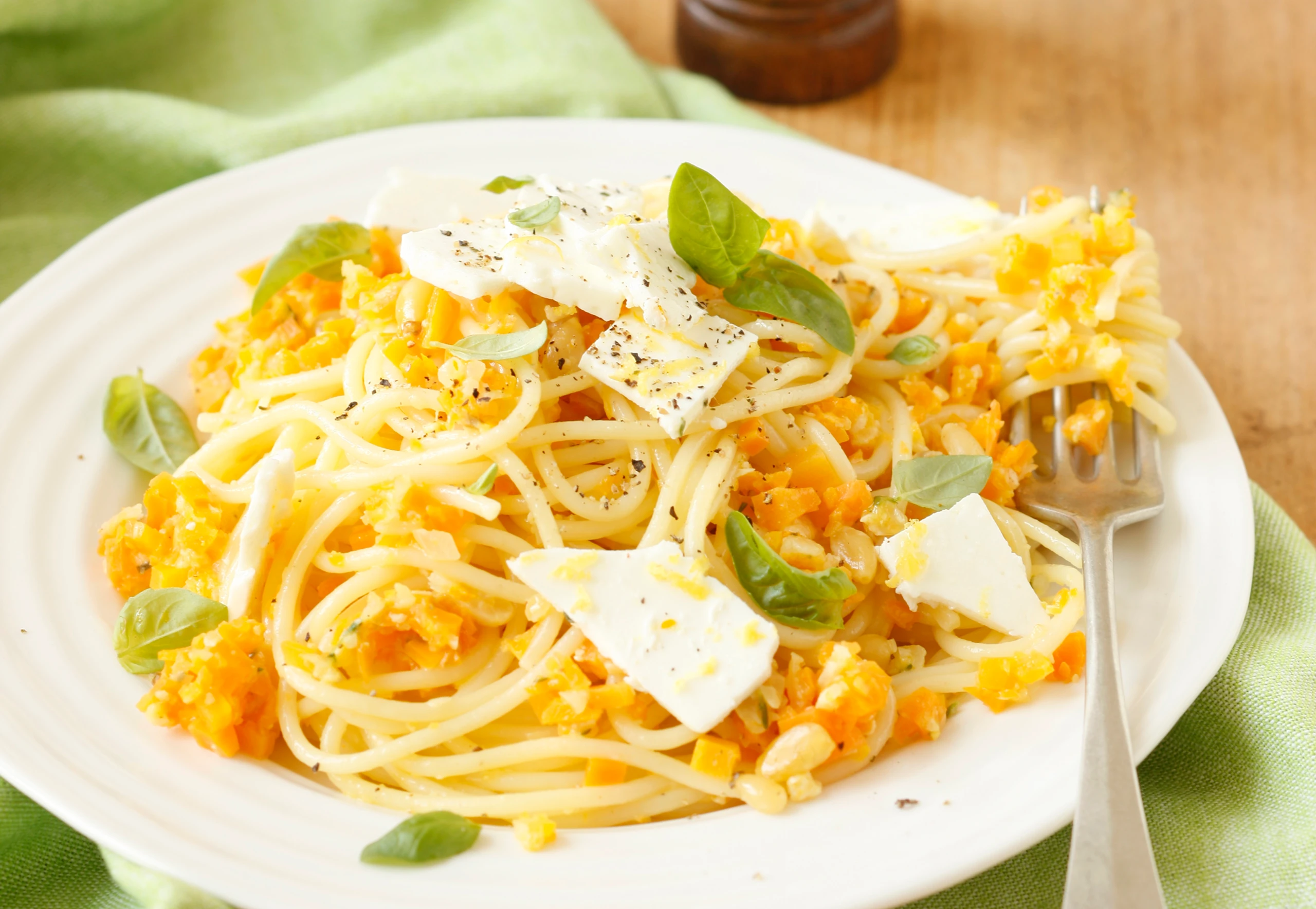 Spaghetti mit Karottenpesto und Feta
