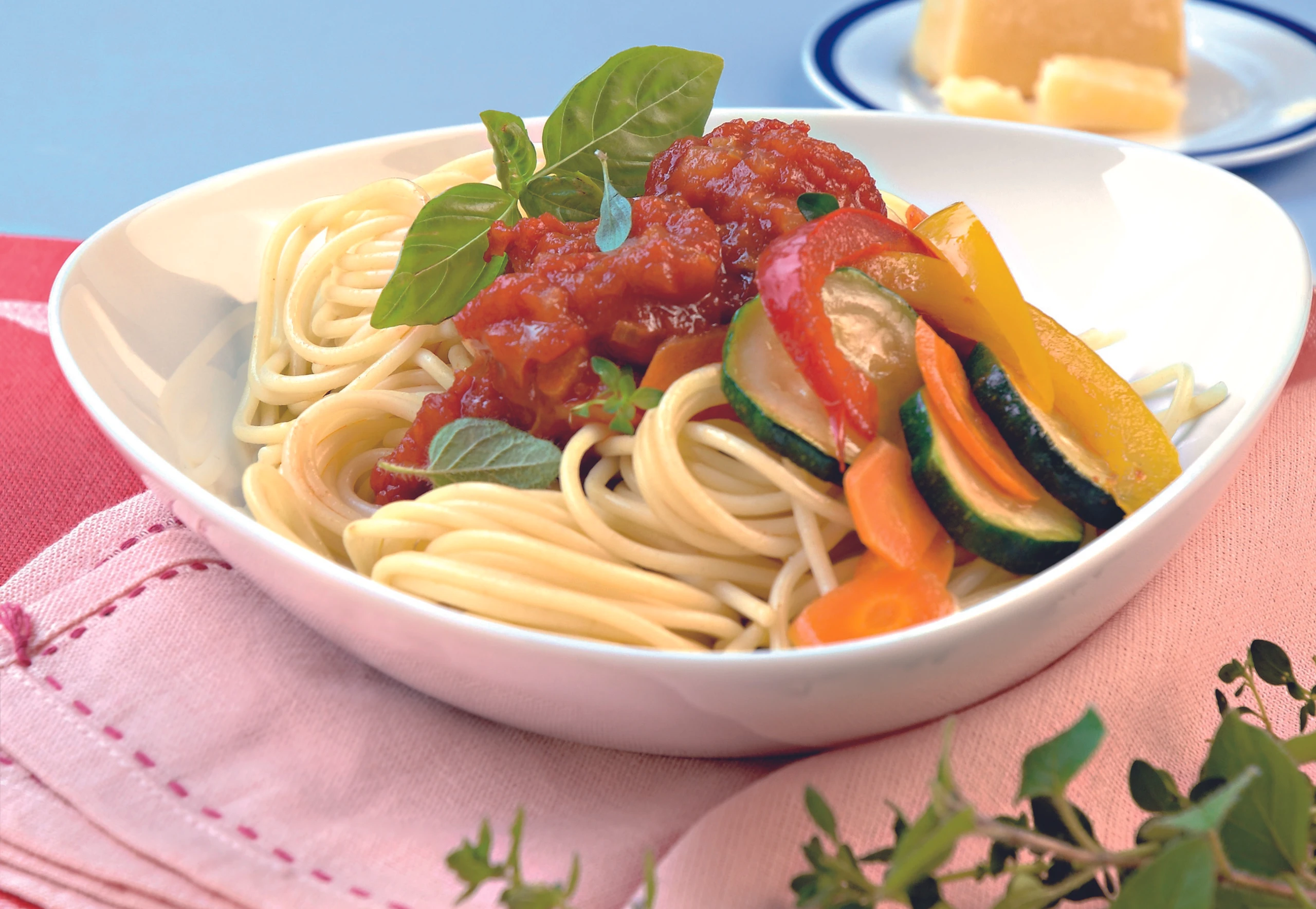 Spaghetti mit Kräutersugo und gebratenem Gemüse
