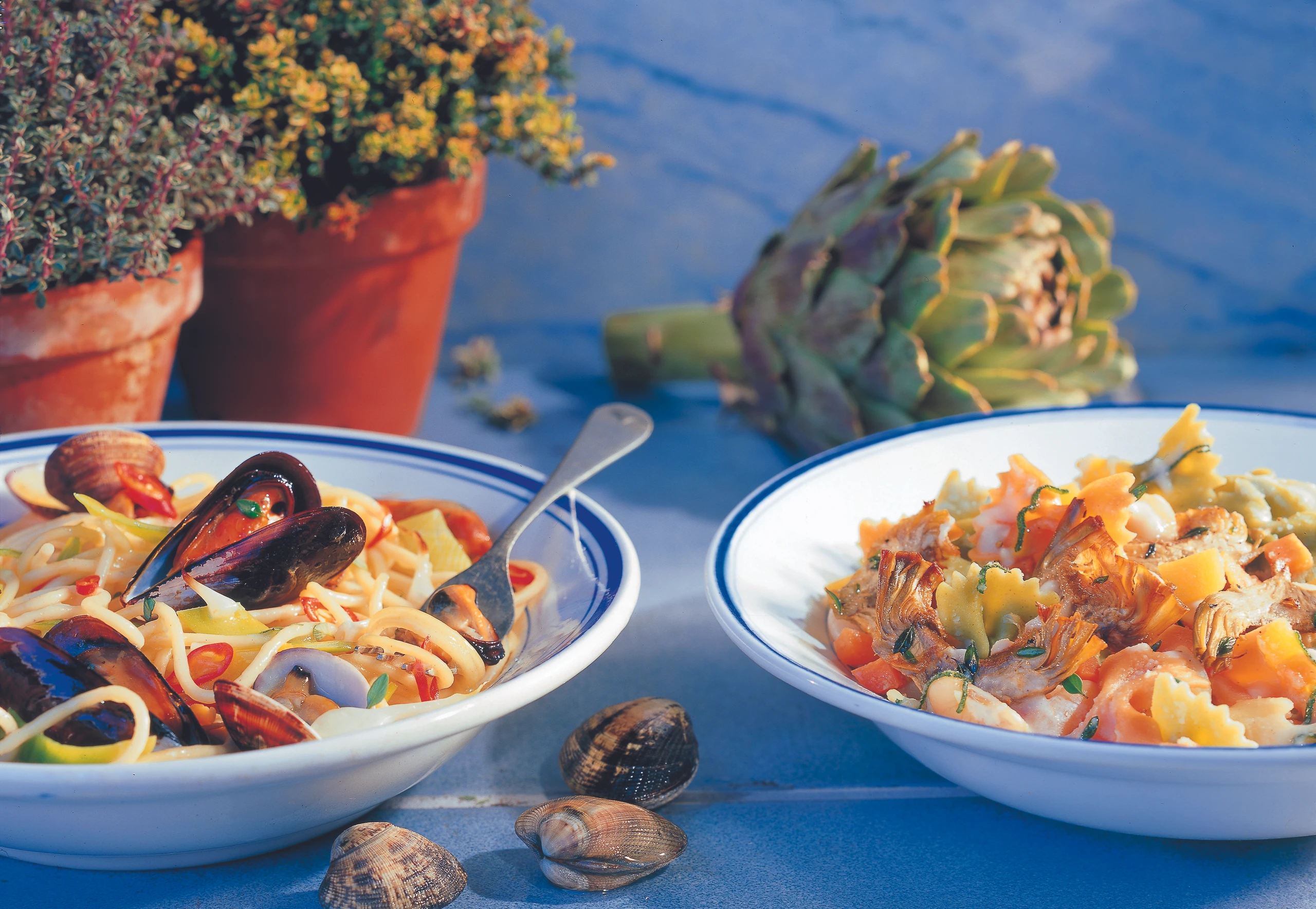 In einem weiten Topf 2 EL Olivenöl erhitzen. Zwiebel darin anschwitzen, Muscheln, Knoblauch und Lorbeerblatt zugeben. Muscheln mit Wein aufgießen und zugedeckt ca. 8 Minuten dünsten, dabei den Topf einige Male rütteln. Achtung: Deckel nicht abnehmen – Spritzgefahr! Am Ende der Garzeit sollten alle Muscheln geöffnet sein.