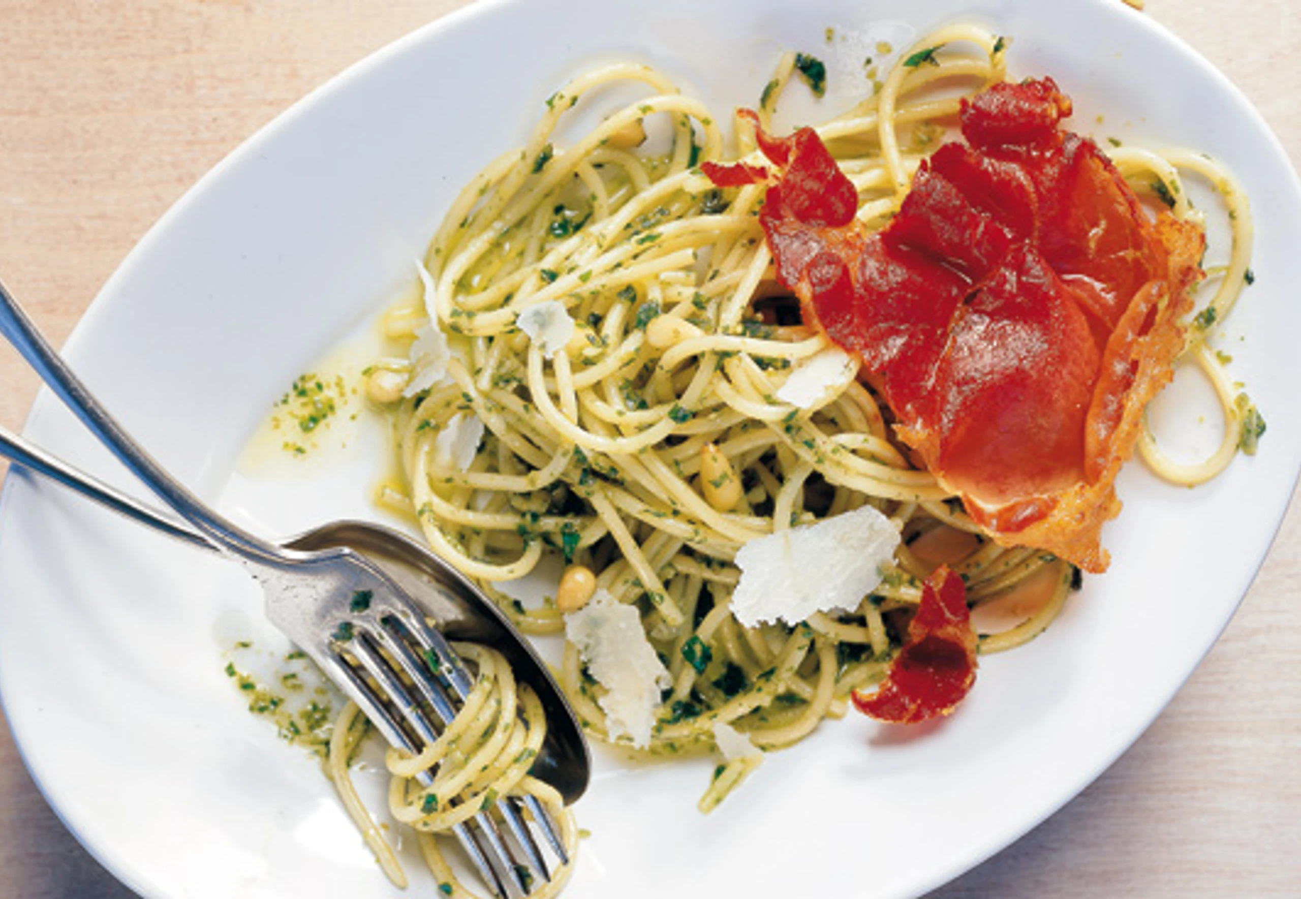 Spaghetti mit Pesto und Prosciutto