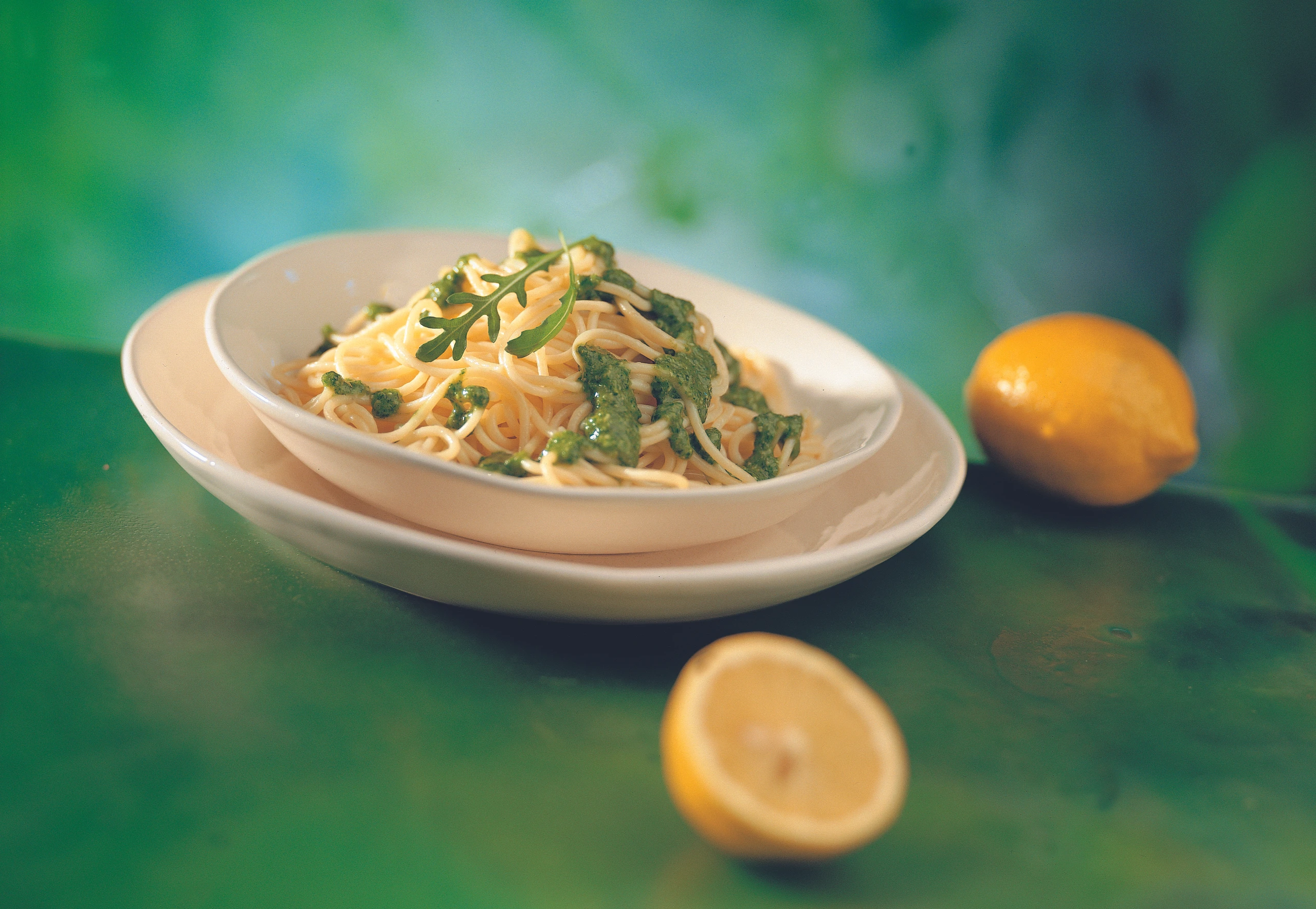 Ausreichend Wasser zum Spaghetti kochen zustellen. Inzwischen Petersil und Rucola waschen, gut abtropfen lassen, fein schneiden und in ein schmales, hohes Gefäß geben. Suppe, Zitronensaft und Olivenöl zugießen. Mischung mit einem Stabmixer kurz durchmixen, Parmesan zugeben und alle Zutaten zu einer feinen Sauce pürieren. Sauce mit Salz und Pfeffer würzen.