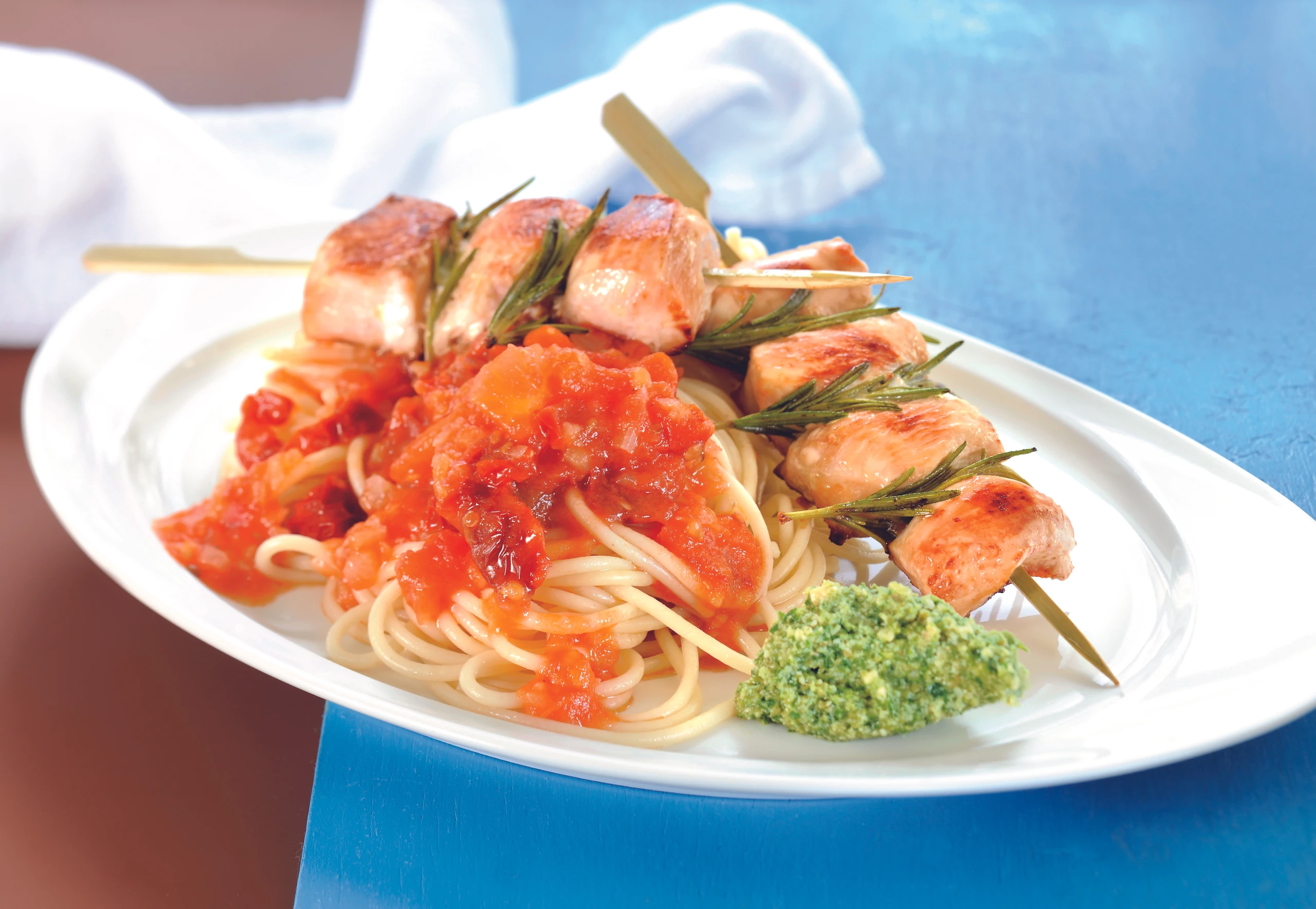 - Spaghetti in reichlich Salzwasser bissfest kochen. Abseihen, abtropfen lassen, mit Sugo, Hühnerspießchen und Pesto anrichten.