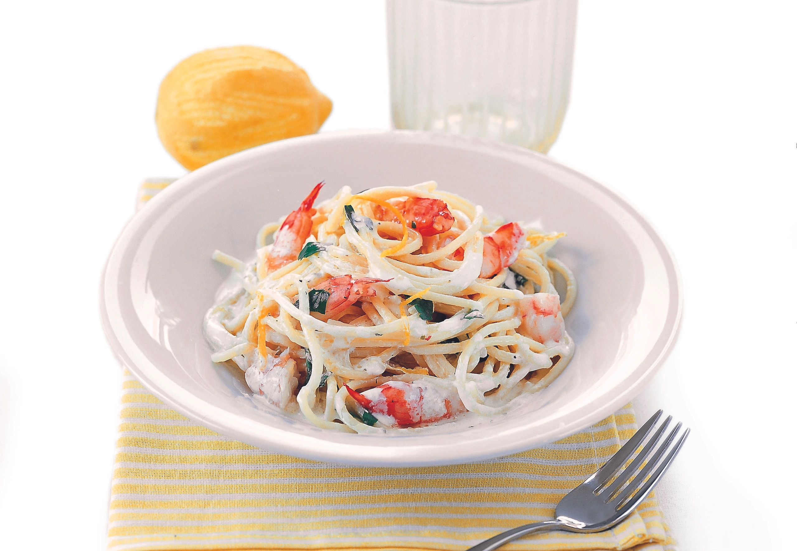 Zitronenschale dünn abheben und grob schneiden. Knoblauch bei schwacher Hitze in Butter anbraten, Zitronenschale einrühren. Suppe zugießen, Crème fraîche einrühren. Sauce salzen, pfeffern und ca. 1 Minute köcheln. Knoblauch entfernen. Shrimps und Petersilie einrühren.