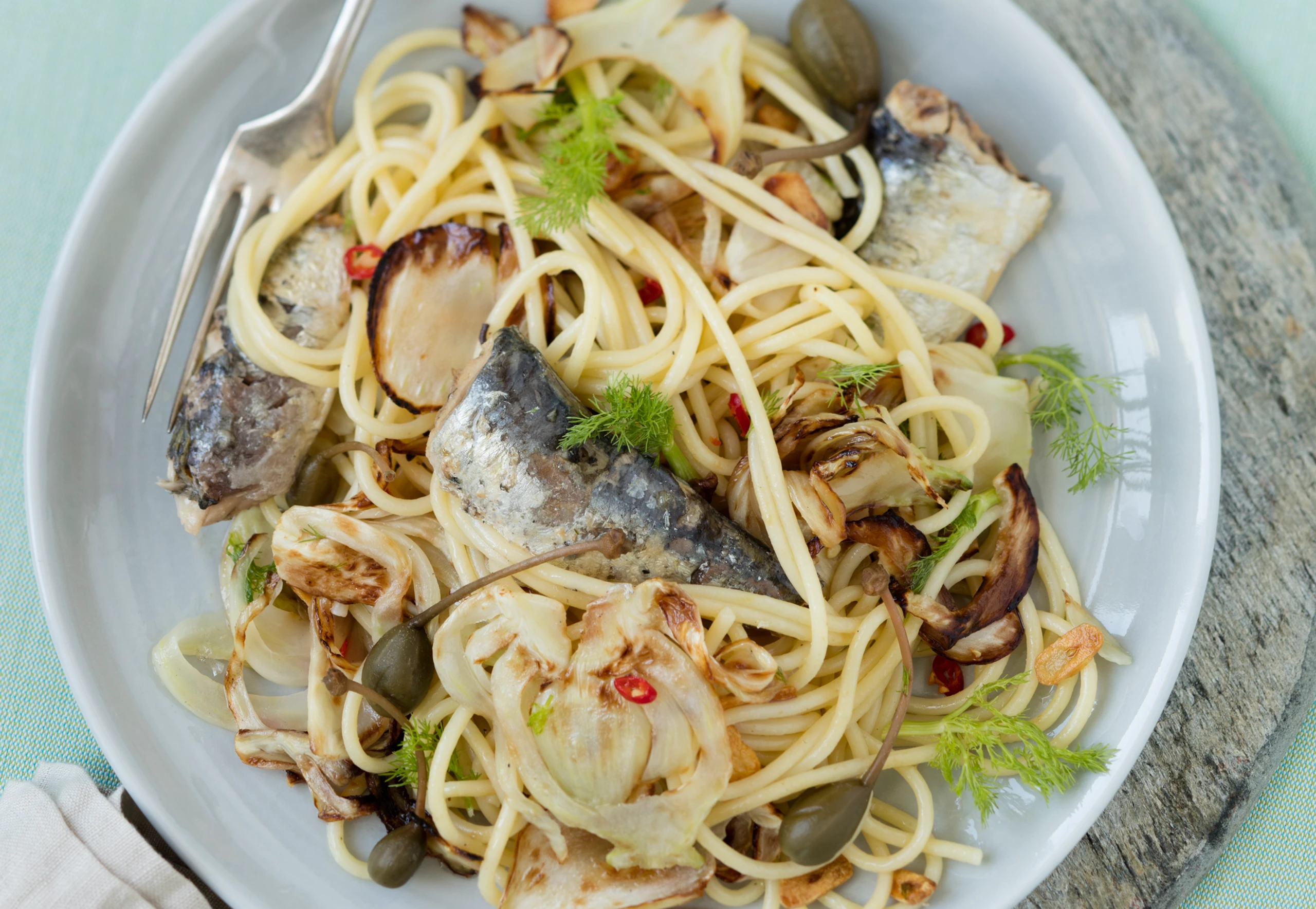 Fenchelscheiben im Öl beidseitig knusprig braten, Knoblauch und Chili zugeben und kurz mitbraten; dabei öfters umrühren. Mischung aus der Pfanne nehmen. Bratrückstand mit Suppe aufgießen, aufkochen und mit Kapern, Spaghetti, Fenchelmischung und Fenchelgrün vermischen. Spaghetti mit den Sardinen anrichten.