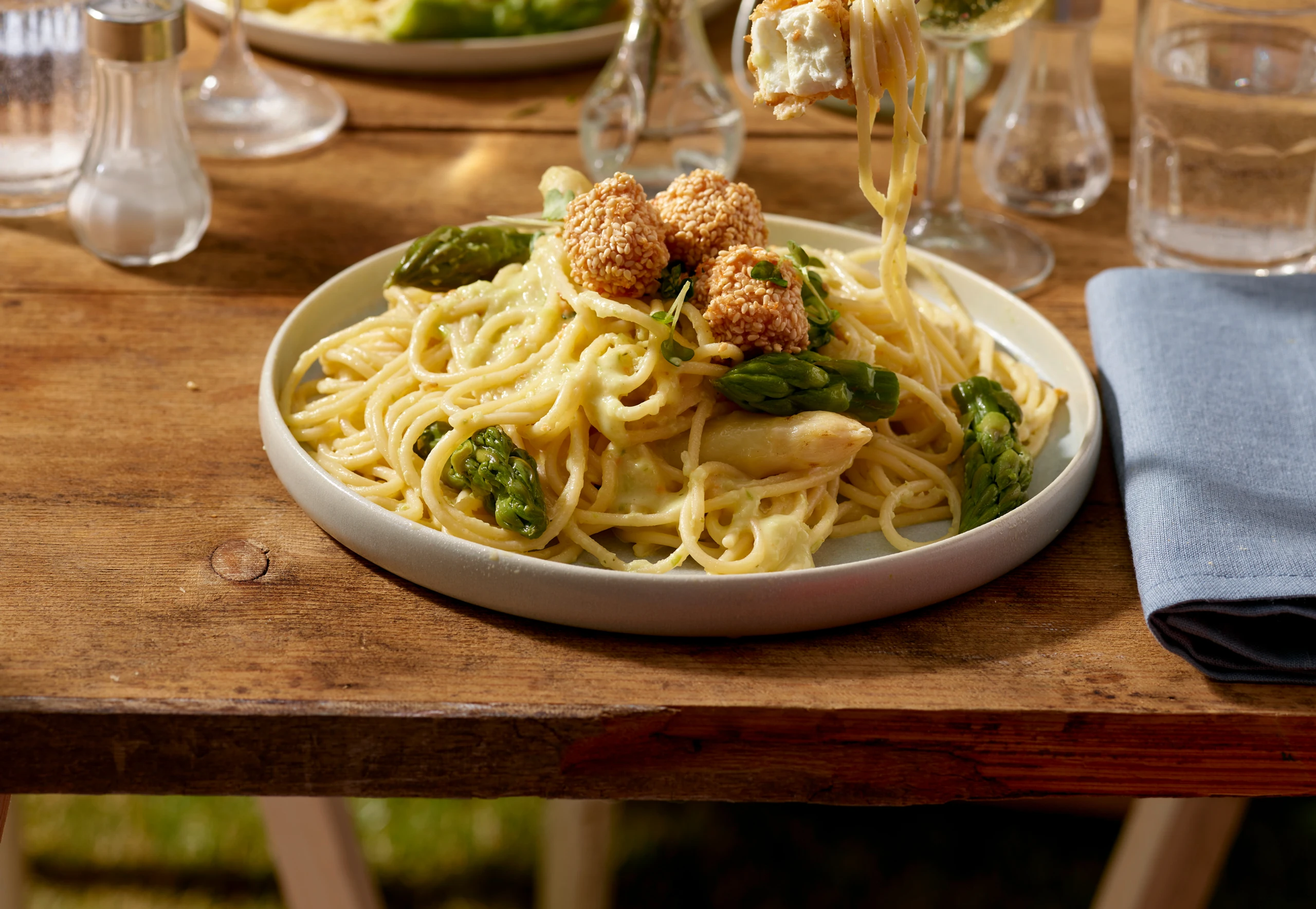 Spaghetti mit Spargelsauce und Feta-Sesamwürfeln