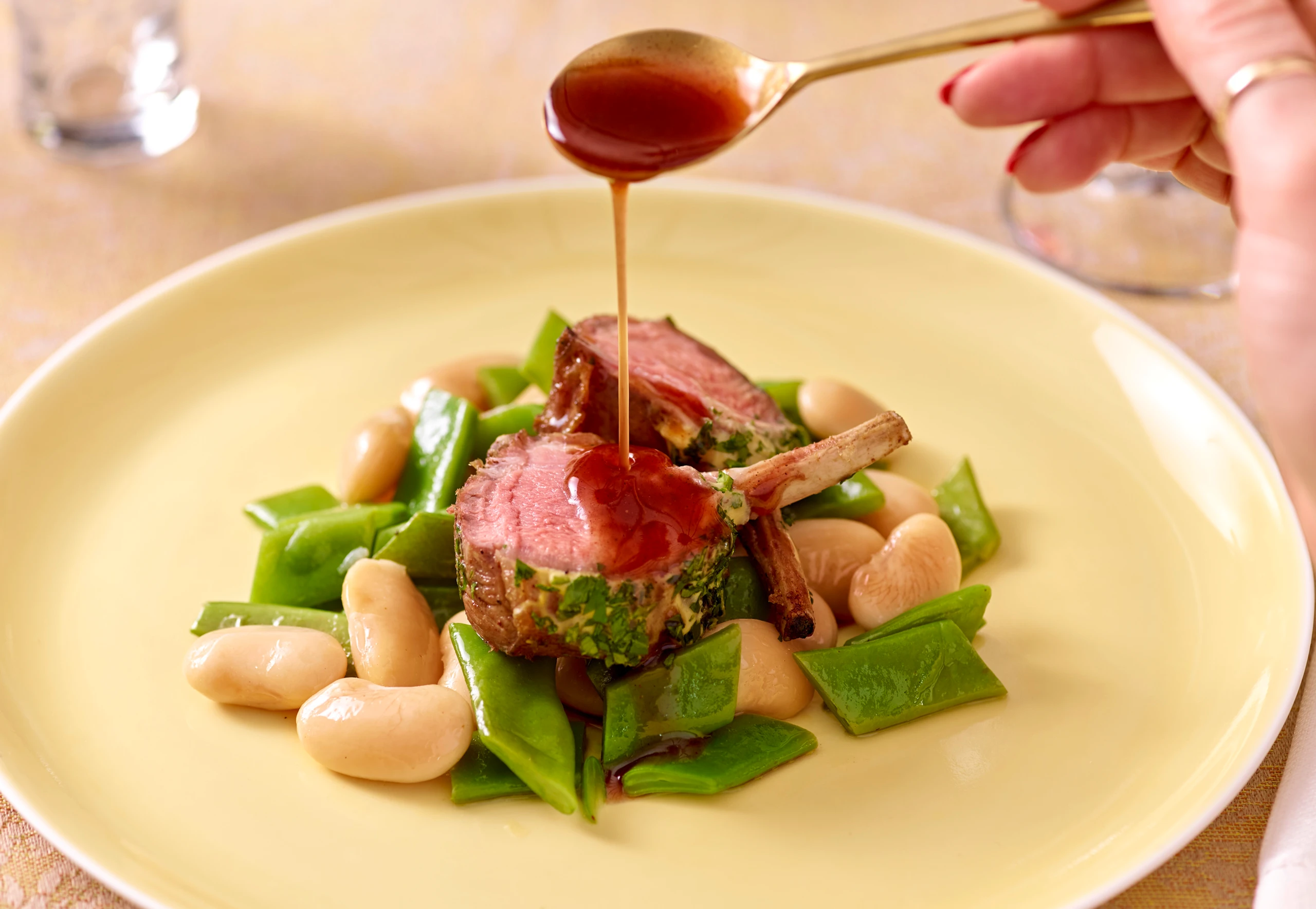 Für das Gemüse Bohnen abspülen und abtropfen lassen. Fisolen putzen, in Salzwasser bissfest kochen, abseihen, abschrecken und abtropfen lassen. Fisolen quer in ca. 2 cm breite Stücke schneiden. Lammrückenfilets Rücken an Rücken mit Spagat zusammenbinden.
