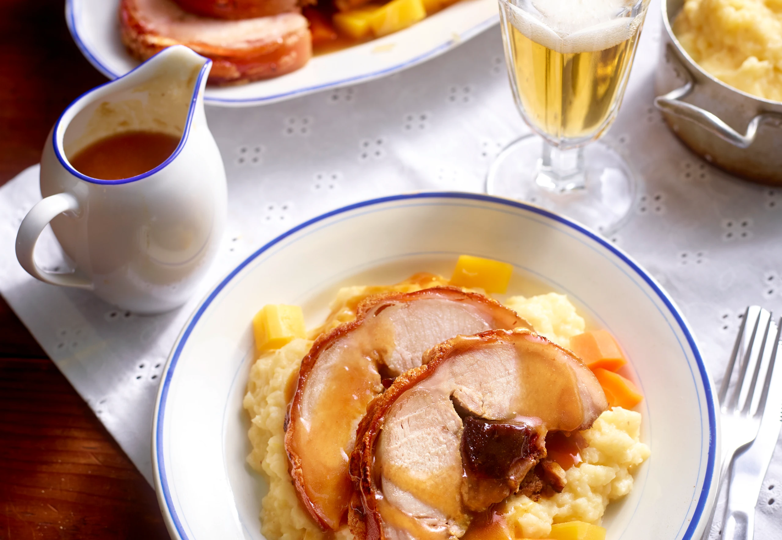 Spanferkel mit Dörrzwetschken und Selleriepüree