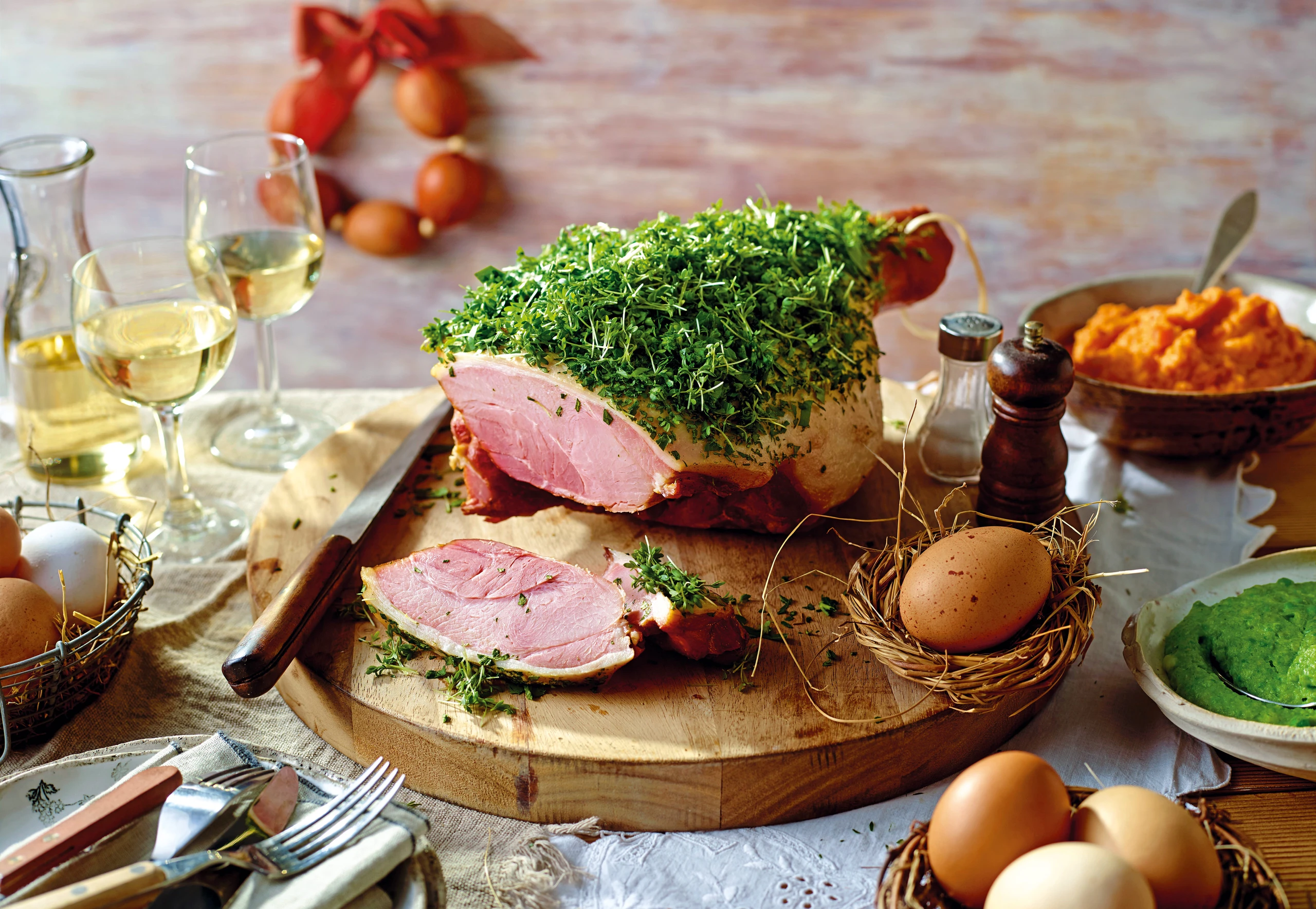 Schinken mit der Senf-Krenmischung bestreichen und mit den gehackten Kräutern und der übrigen Kresse dicht bestreuen. Kräuter behutsam andrücken. Schinken aufschneiden und mit Karotten- und Erbsenpüree servieren.