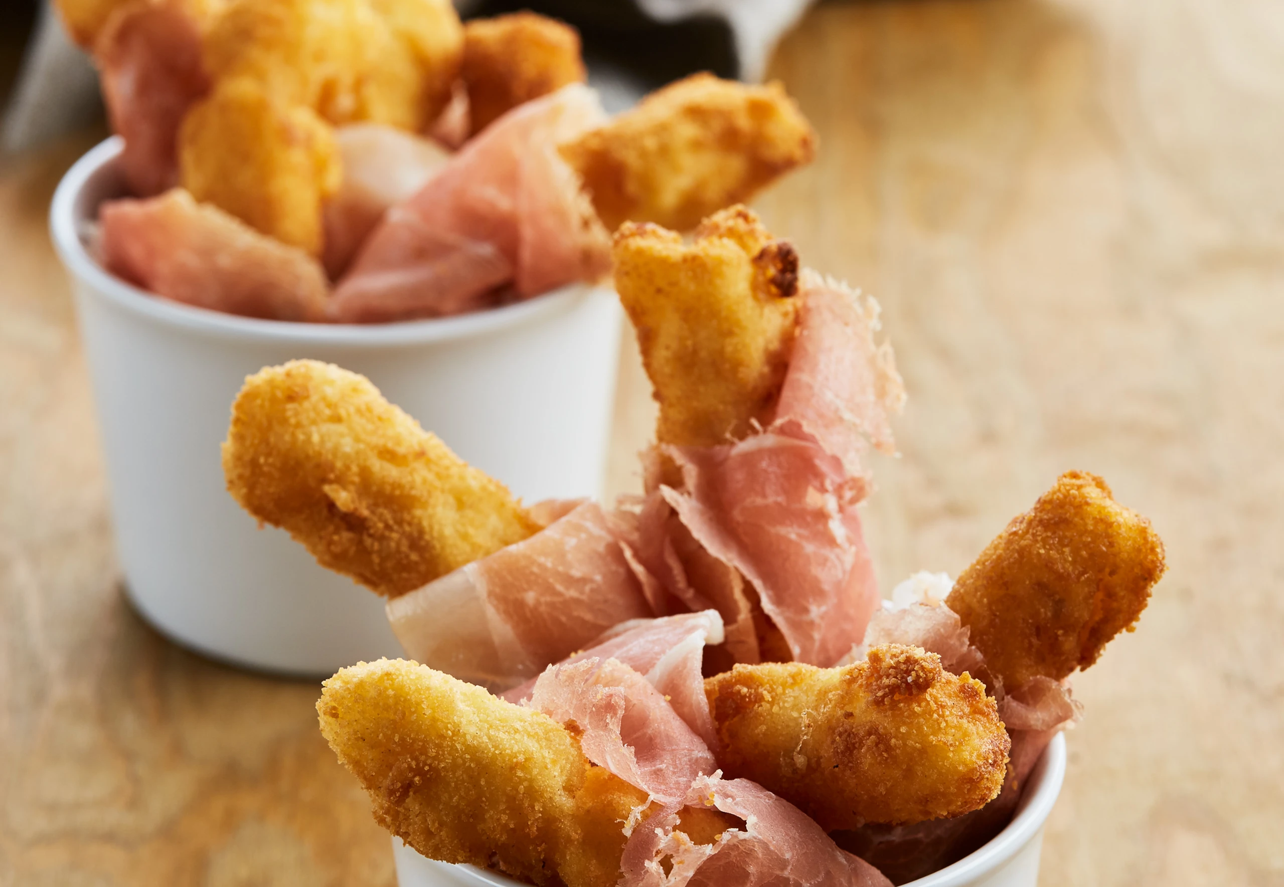 Schinkenscheiben quer halbieren. Kroketten an den Enden mit je einer halben Schinkenscheibe umwickeln.