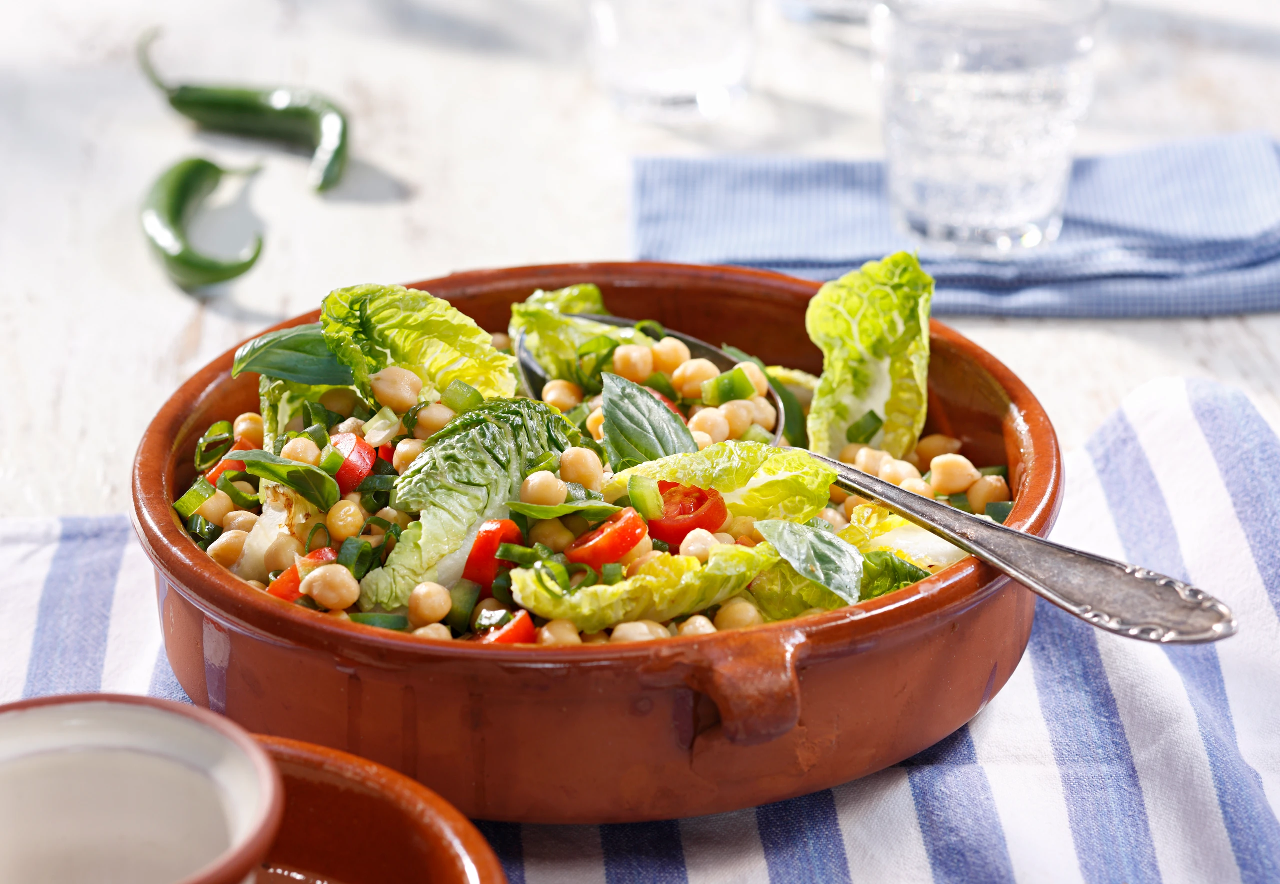 Kichererbsen in ein Sieb leeren, kalt abspülen und abtropfen lassen. Paradeiser halbieren. Paprika entkernen und in kleine Würfel schneiden. Jungzwiebeln putzen und in dünne Scheiben schneiden. Salatherzen waschen und zerpflücken. Basilikumblätter in Streifen, Chili in dünne Ringe schneiden.