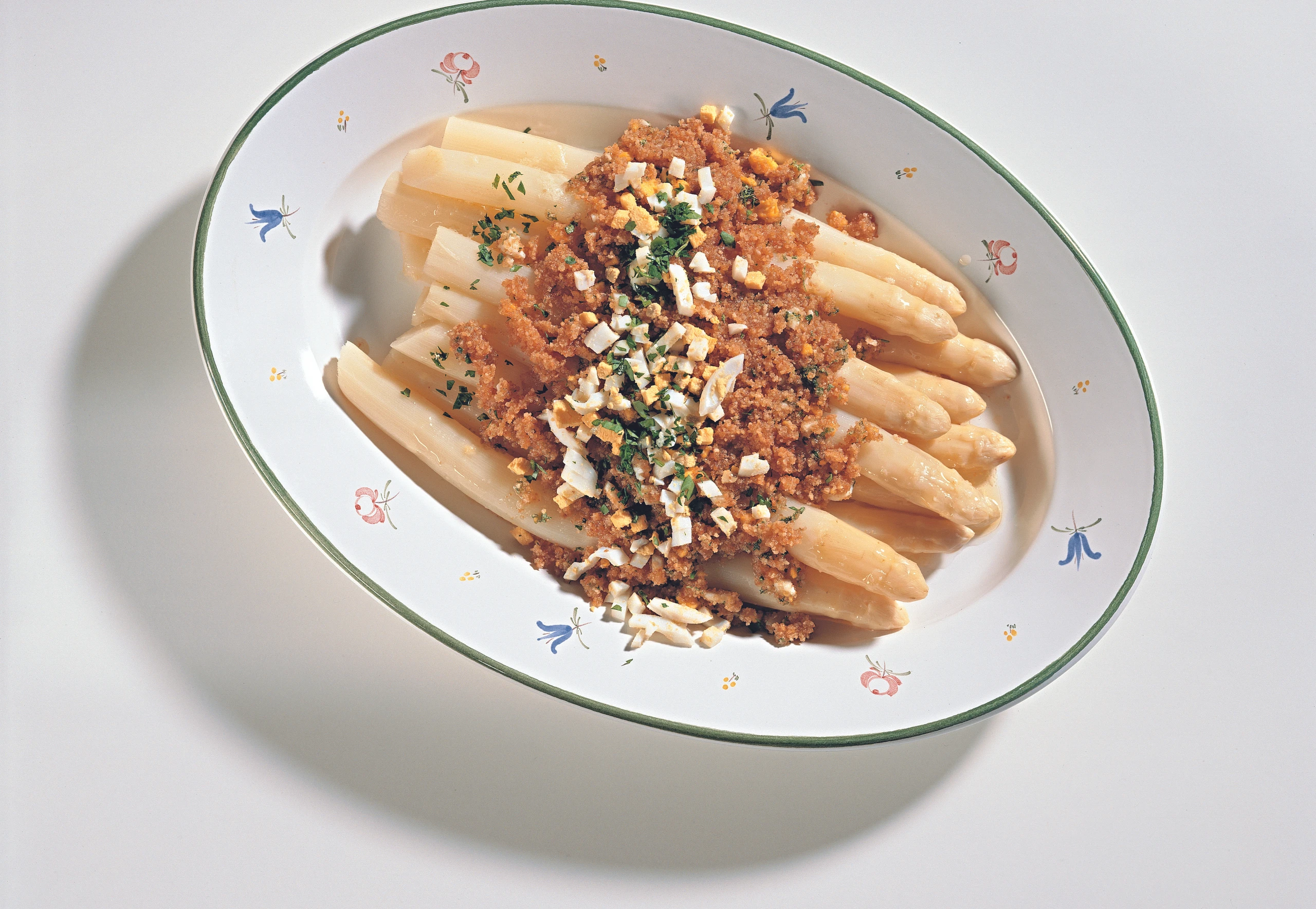 - Spargel aus dem Kochfond heben, gut abtropfen lassen und auf einer vorgewärmten Platte anrichten. Übrige Butter bis zur leichten Braunfärbung erhitzen. Spargel mit Butterbröseln, gehackten Eiern und Petersil bestreuen. Mit brauner Butter beträufeln oder die Butter separat dazu servieren.