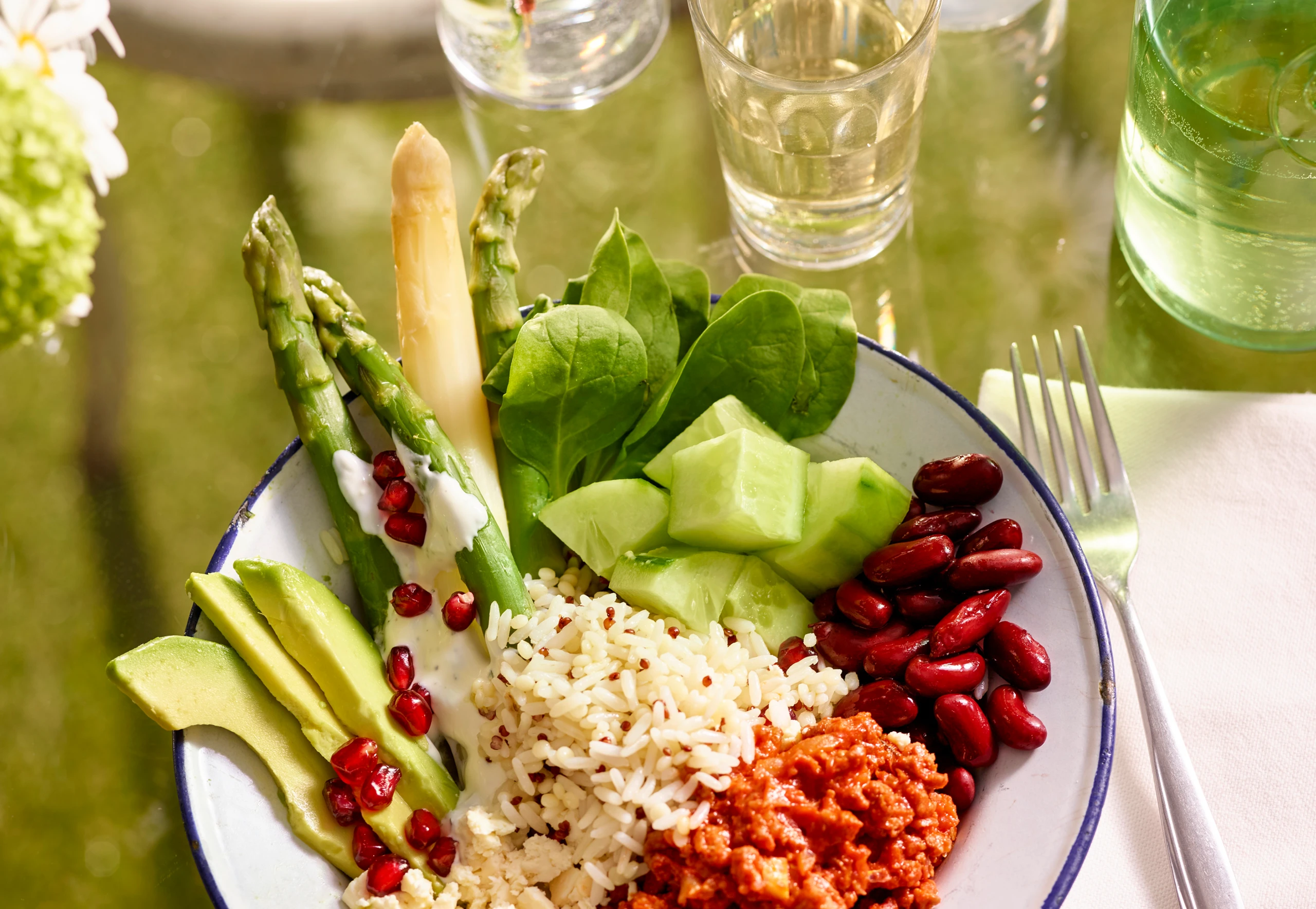 - Für die Minzesauce alles Zutaten verrühren. Für das Dressing alle Zutaten verrühren und mit Salz und Pfeffer würzen. Spargel, Avocado, Gurke, Spinat, Faschiertes, Reis, Bohnen und Feta in einer großen Bowl anrichten, mit dem Dressing übergießen, mit Granatapfelkernen bestreuen und mit der Sauce servieren.
