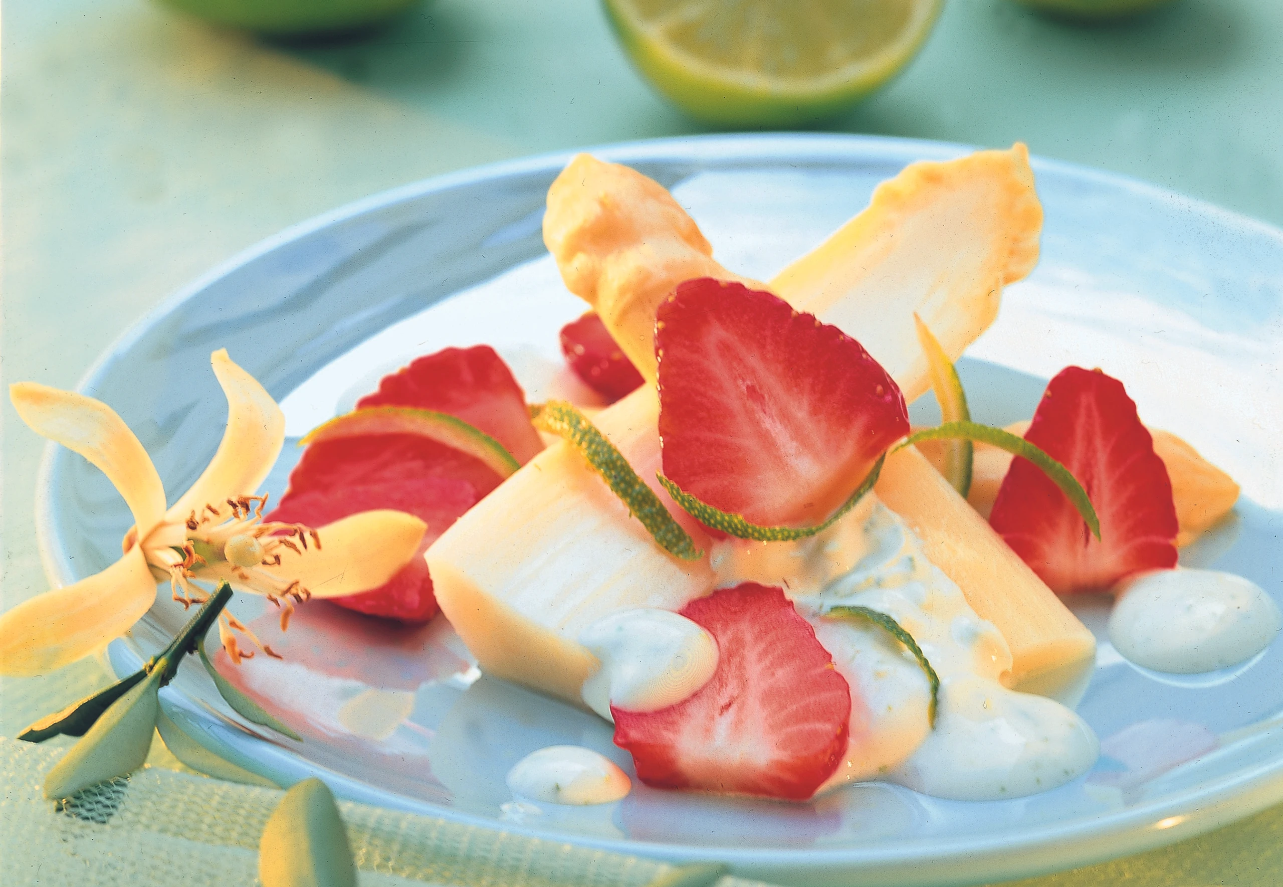 - Sauerrahm mit abgeriebener Limettenschale, Limettensaft sowie Salz und Pfeffer verrühren. Spargel und Erdbeeren auf Tellern anrichten, mit dem Limettenrahm garnieren.