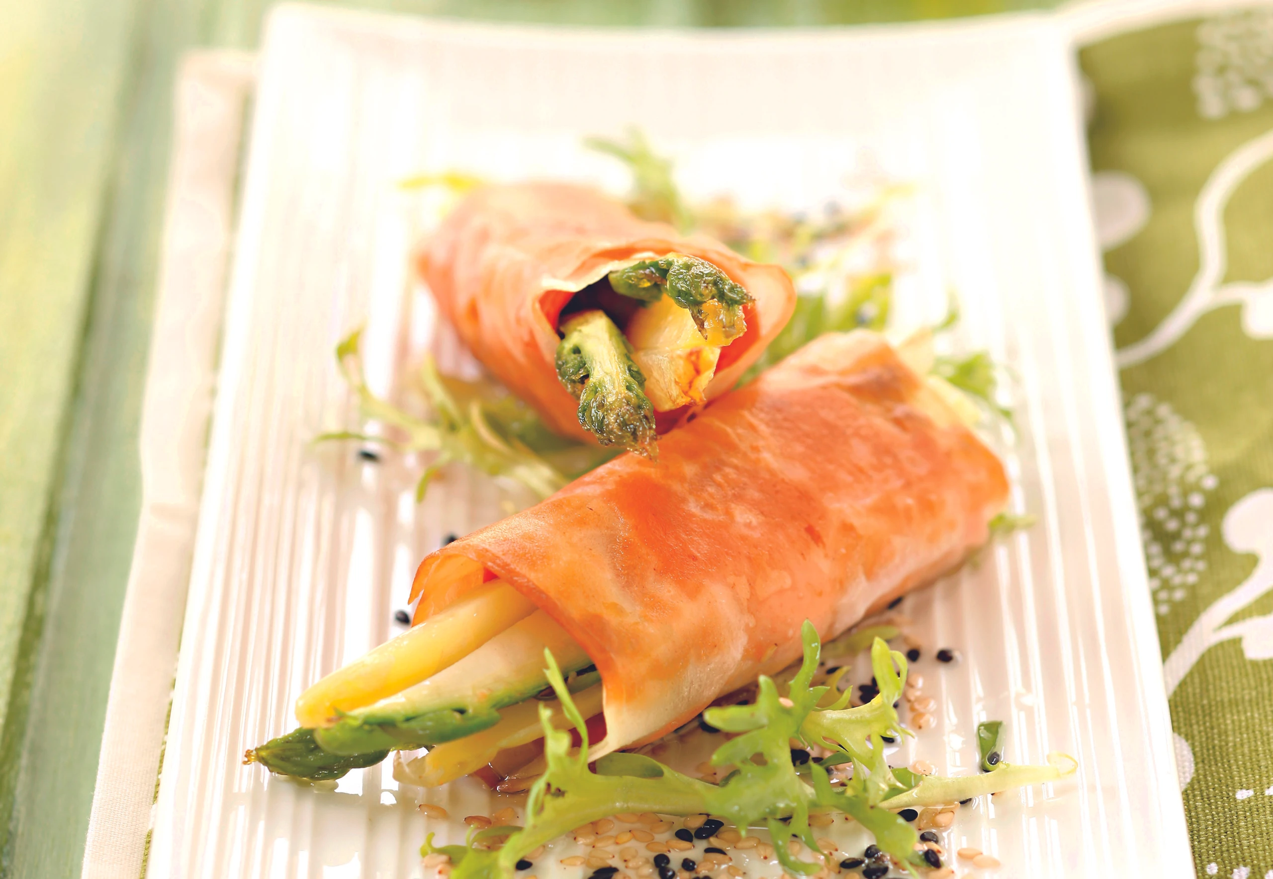 - Für den Salat Limettensaft salzen, pfeffern und mit Sesamöl und Sesam verrühren. Salat mit der Marinade vermischen. Spargelröllchen mit dem Salat anrichten.