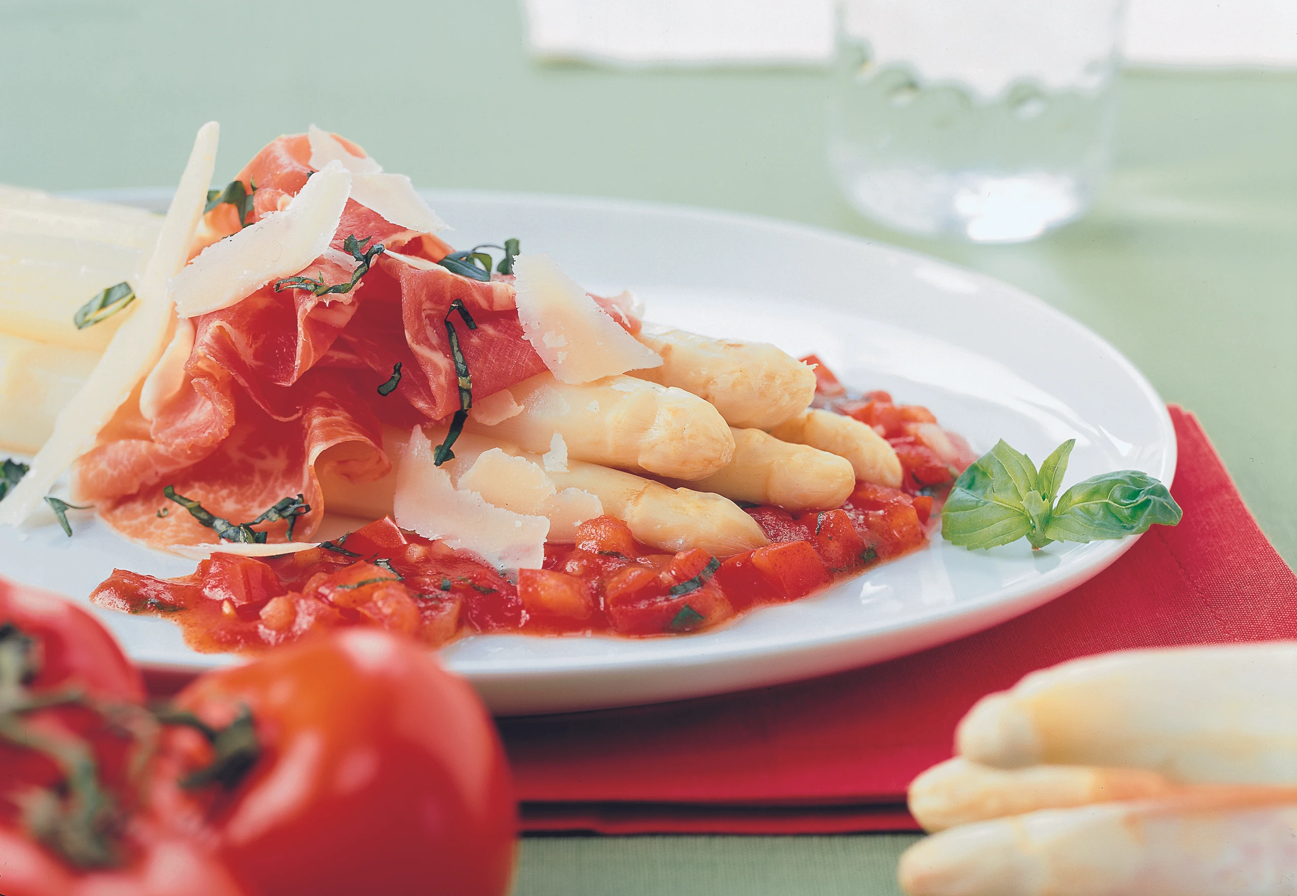Spargel mit der Tomatensauce anrichten, mit Prosciutto belegen, mit Parmesan und restlichem Basilikum bestreuen.